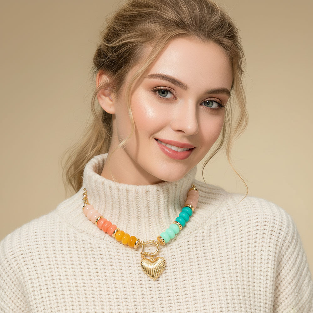 Details • Necklace Size : 17" + 3" L • Decor Size : 2" L • Add a touch of joy and sophistication with this multi-color bead heart pendant necklace. Featuring a radiant mix of tones and a sleek heart charm centerpiece, this necklace blends playful vibrancy with refined elegance—perfect for elevating both casual and chic outfits. • Lead and Nickel Compliant