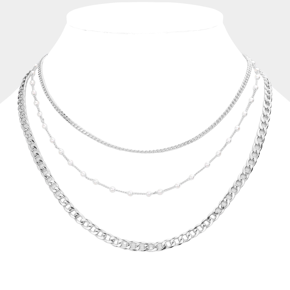 Tiny Pearl Metal Chain Link Triple Layered Bib Necklace