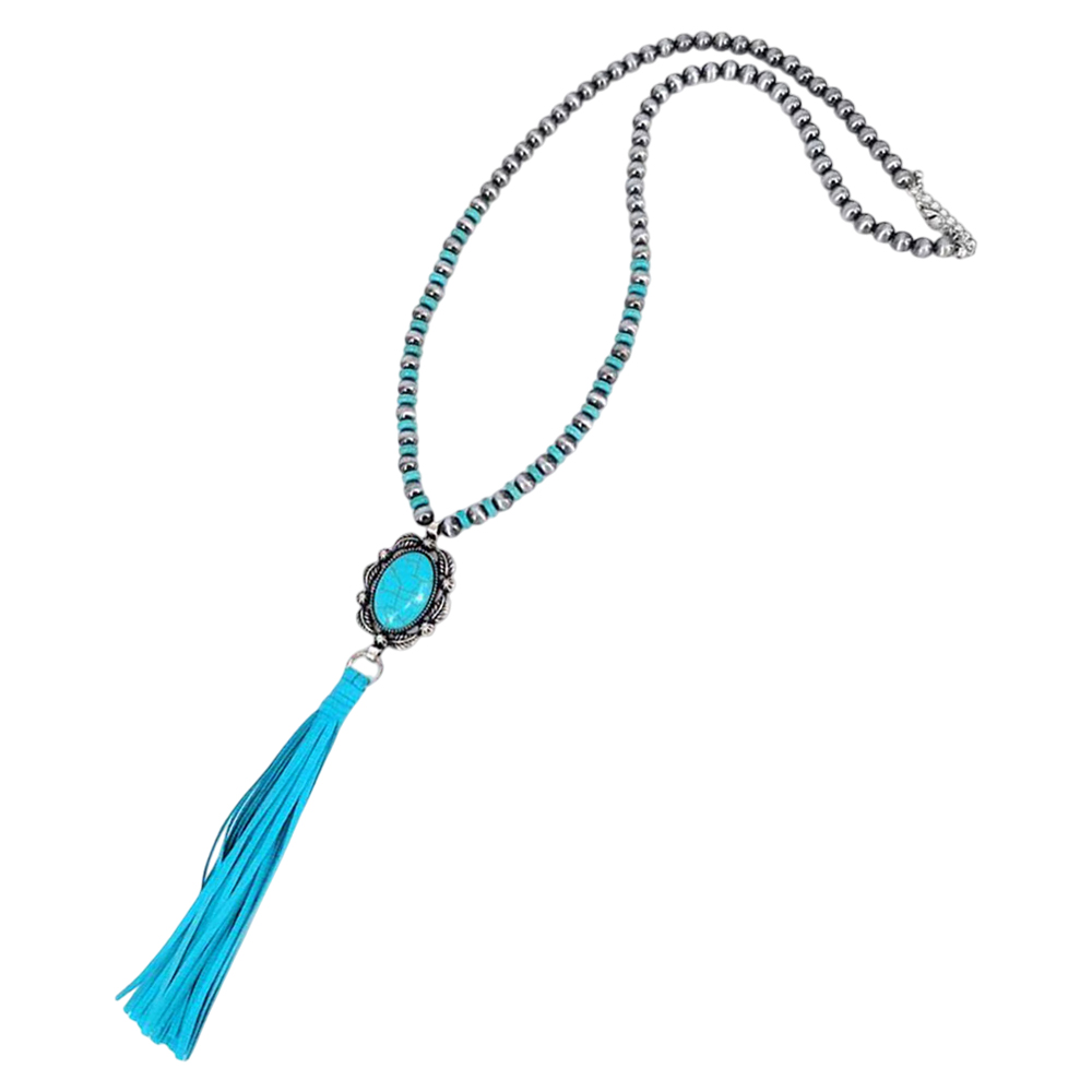 Turquoise Accented Antique Metal Suede Tassel Link Long Necklace
