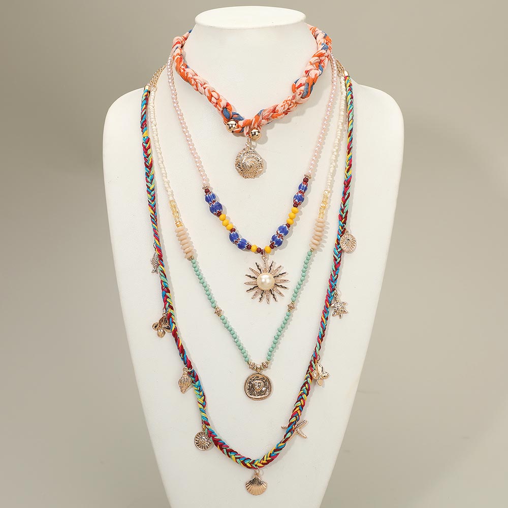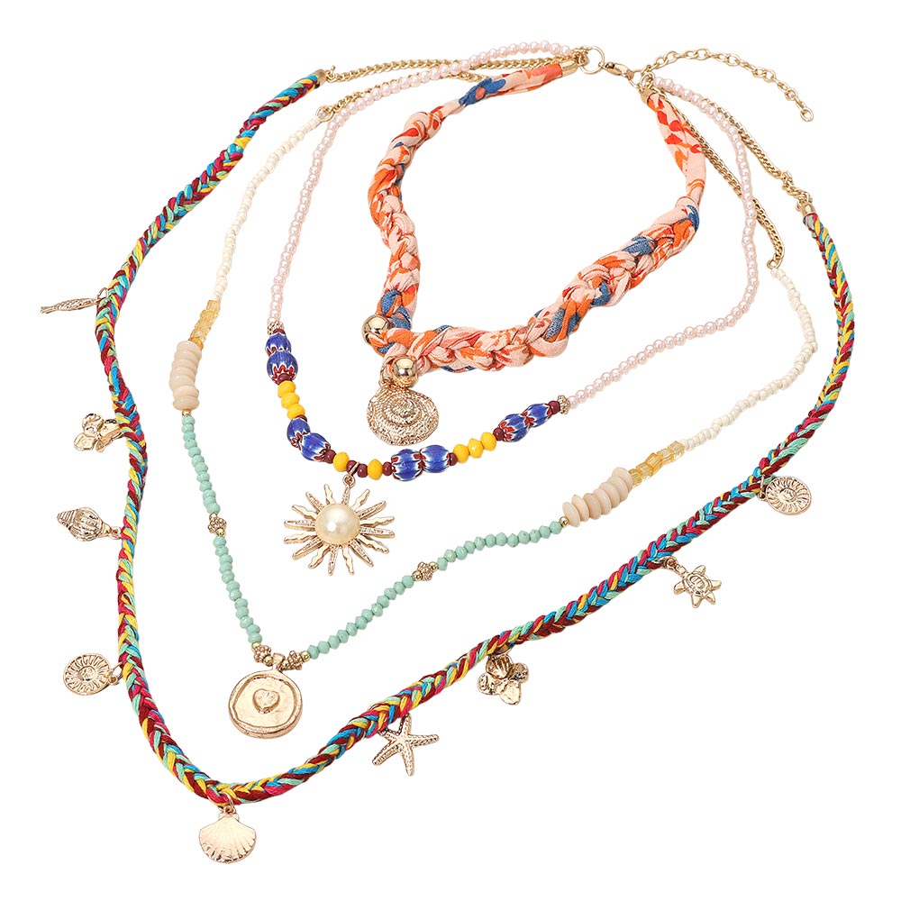 • Stylish multi-layered necklace set featuring braided cords, beaded strands, and assorted charms including sun, seashell, coin, and more. A statement layered accessory that adds playful detail and standout appeal to any outfit. Perfect for everyday wear or vacation looks.