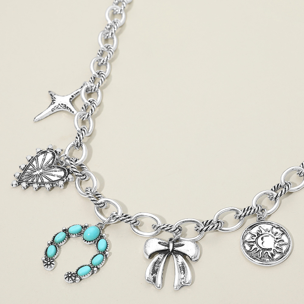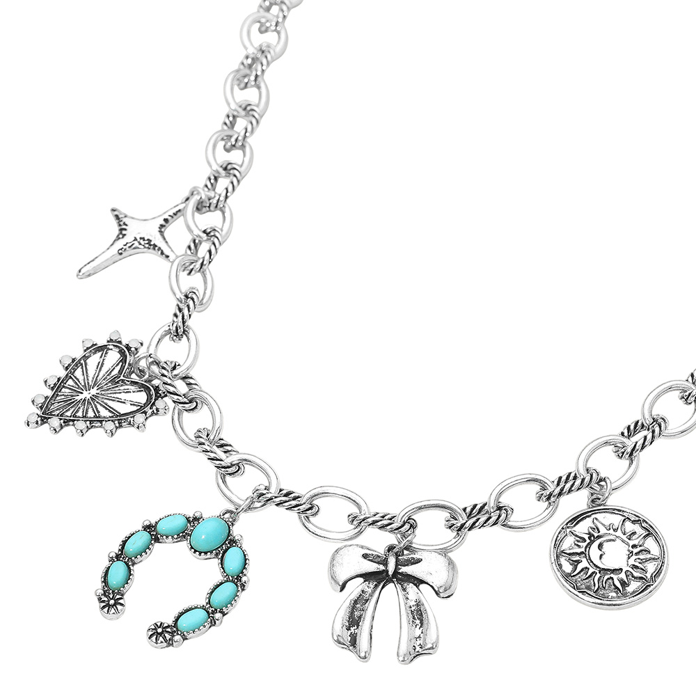 Details • Necklace Size : 17" + 3.5" L • Decor Size : 1.5" L • This vintage-inspired charm necklace features a mix of symbolic pendants including a heart, bow, horseshoe, and celestial motif. Designed on a textured chain, it brings a whimsical and meaningful touch to any outfit, perfect for layering or wearing as a statement piece. • Lead and Nickel Compliant
