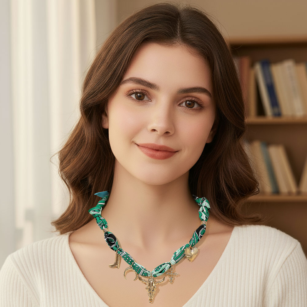 Details • Necklace Size : 28" L • Decor Size : 1.75" L • Print may vary • Make a stylish statement with this scarf necklace featuring Western-inspired charms. Accented with symbolic details like a bull head, crescent, and heart, this versatile accessory blends chic design with rustic flair, perfect for adding personality to any outfit. • Lead and Nickel Compliant