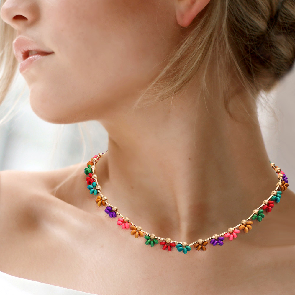 Details • Necklace Size : 16.5" + 3" L • Decor Size : 0.3" L • Charming floral beaded choker necklace featuring small flower accents for a playful, feminine look. Perfect for casual wear or layered styling, this elegant accessory adds a cheerful touch to any outfit, enhancing your style with a fresh, youthful, and vibrant flair. • Lead and Nickel Compliant
