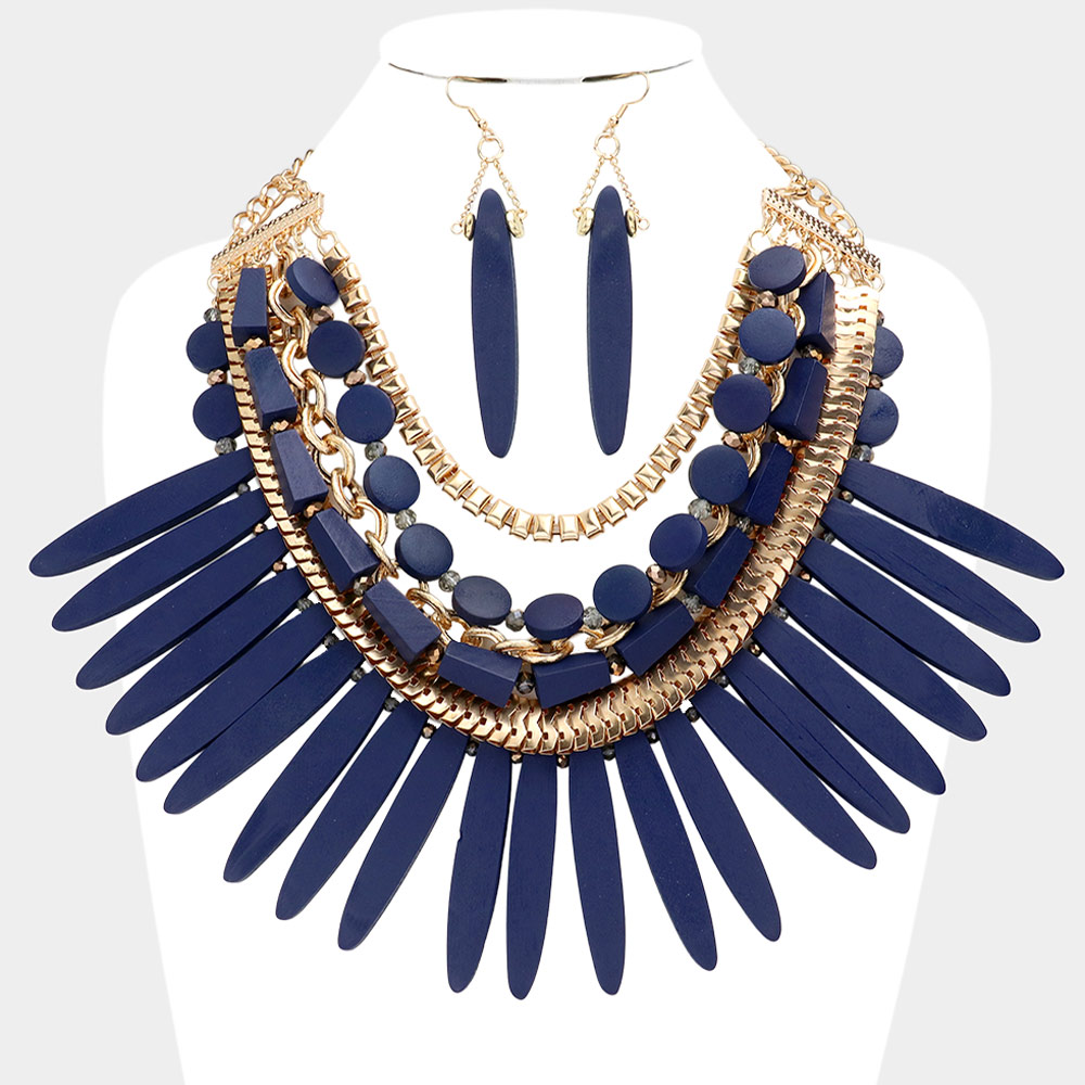 Wooden Spike Accented Metal Chain Layered Bib Necklace