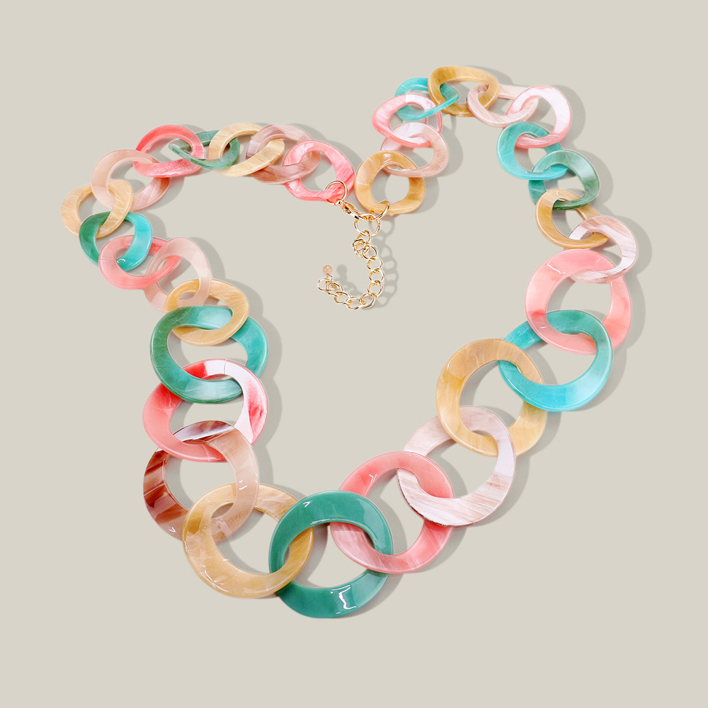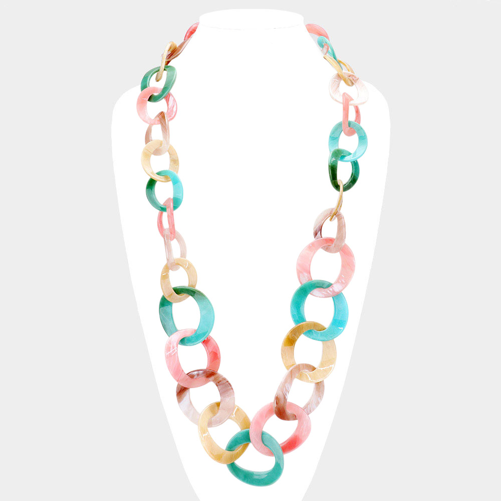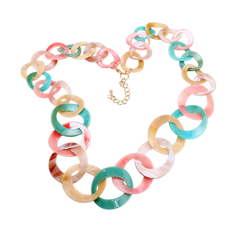 Details • Necklace Size : 36" + 3" L • Decor Size : 1.8" L • Make a bold impression with this chunky statement necklace featuring oversized interlocking links and a glossy finish. Lightweight yet impactful, it’s perfect for elevating casual or dressy looks. Ideal for fashion-forward styling or as a standout gift piece. • Lead and Nickel Compliant