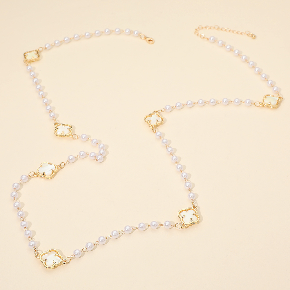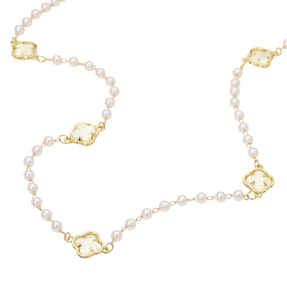 Details • Necklace Size : 36" + 3.5" L • Decor Size : 0.6" L • A delicate strand featuring evenly spaced round pearl accents and quatrefoil-inspired connectors that create a graceful, balanced look. Perfect for everyday elegance or special occasions with a refined, timeless aesthetic. • Lead and Nickel Compliant