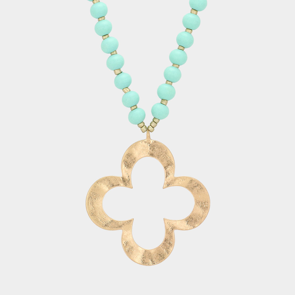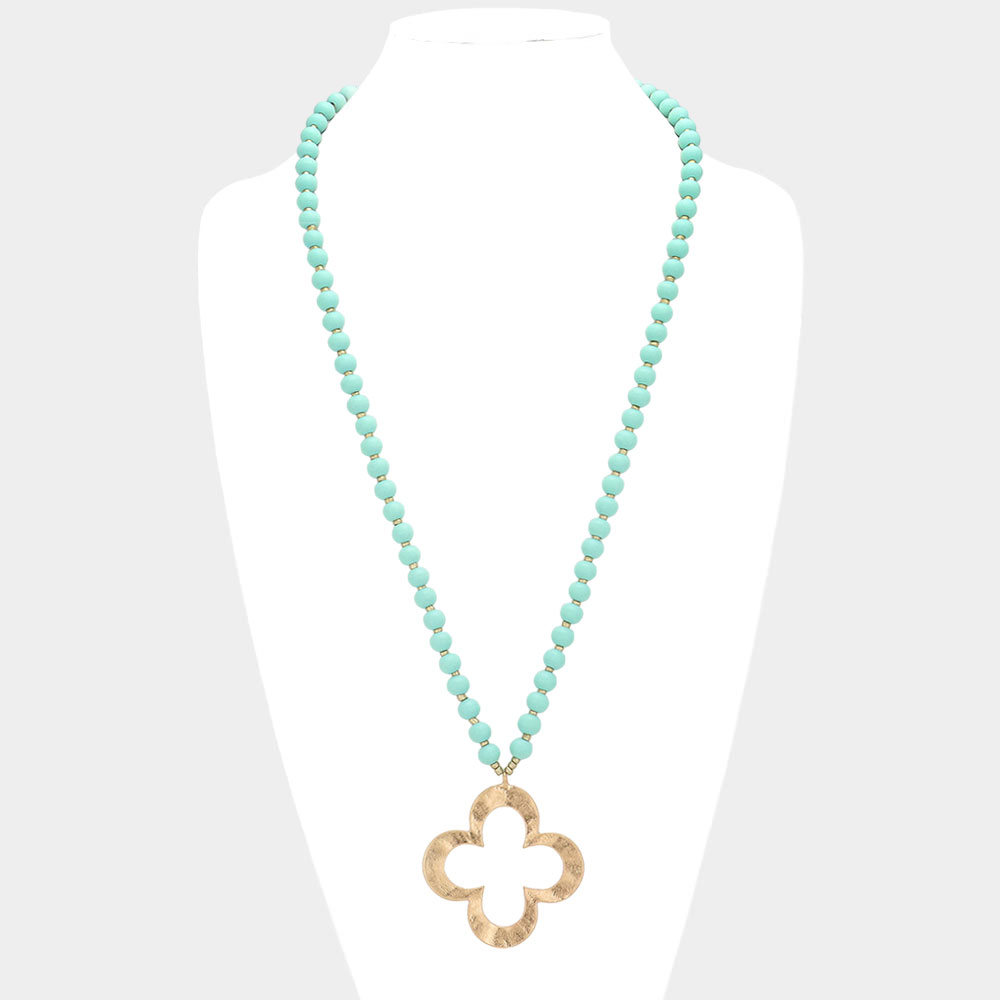 Hammered Metal Quatrefoil Pendant Wood Long Necklace