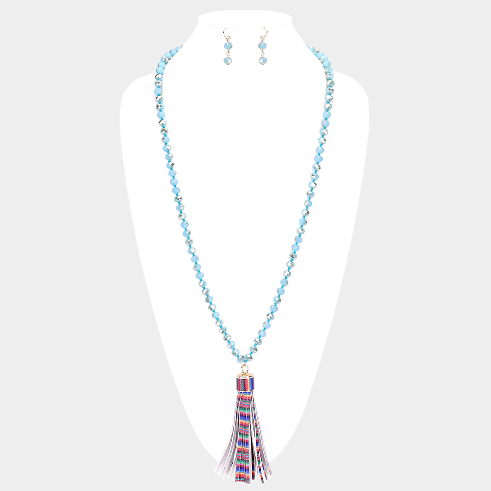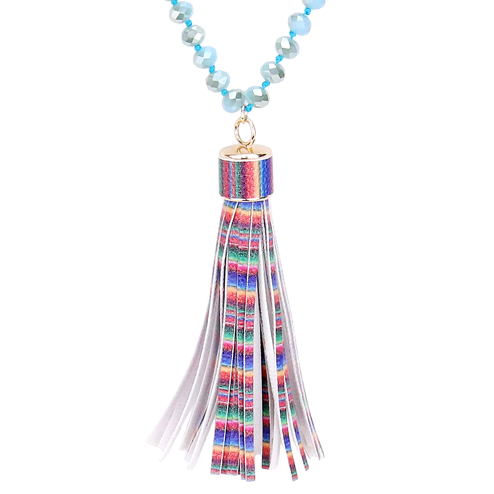 Serape Faux Leather Tassel Faceted Bead Long Necklace