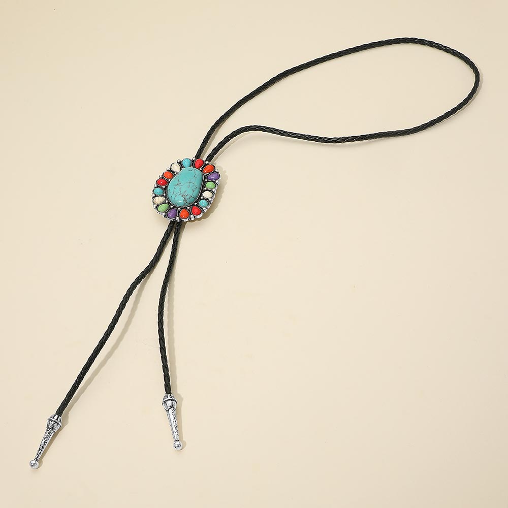 Western Oval Turquoise Concho Faux Leather Bolo Tie Necklace