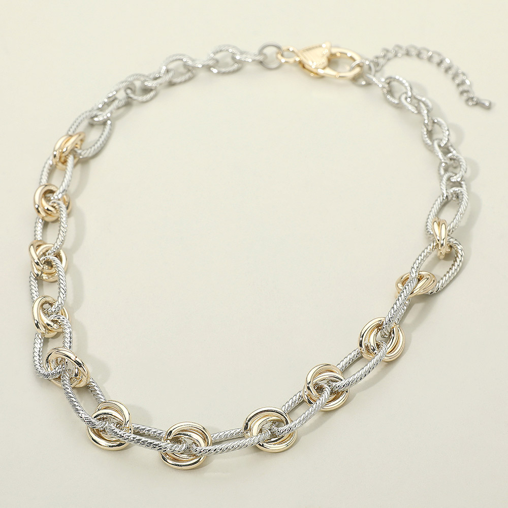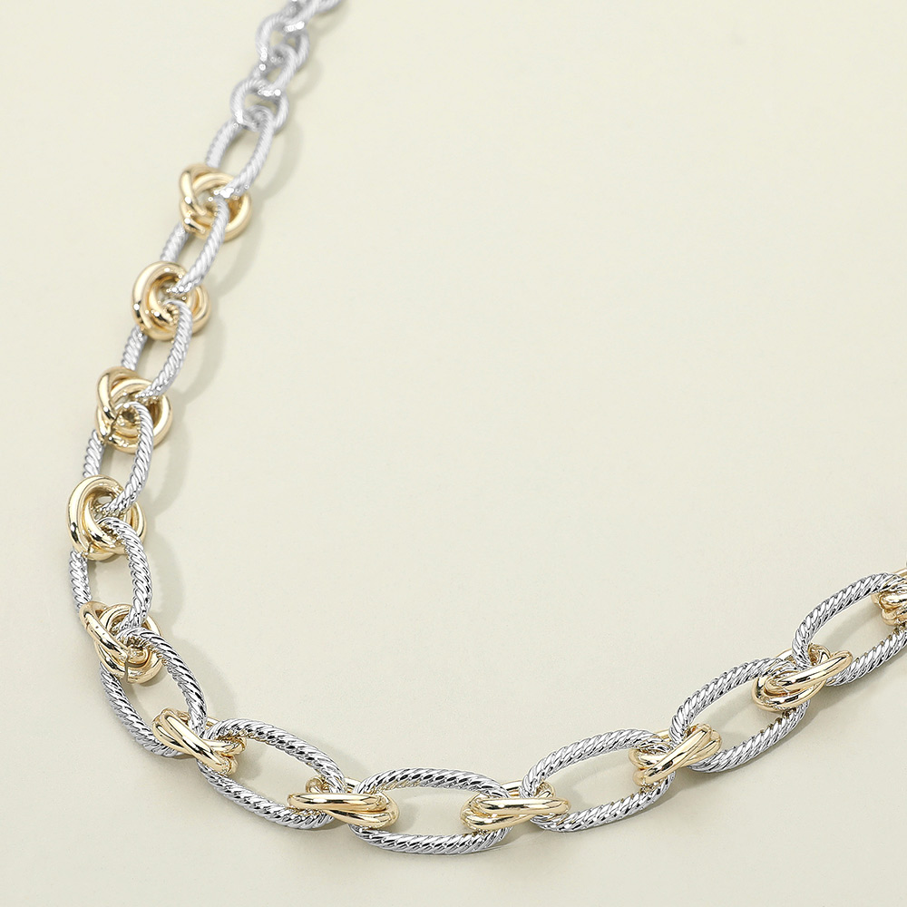 Details • Necklace Size : 17" + 2" L • Decor Size : 0.4" L • A versatile chain necklace with textured rope-style oval links accented by polished knot connectors. Its unique interplay of texture and shine makes it a standout statement piece, perfect for layering or wearing solo for a modern, sophisticated look. • Gold Dipped