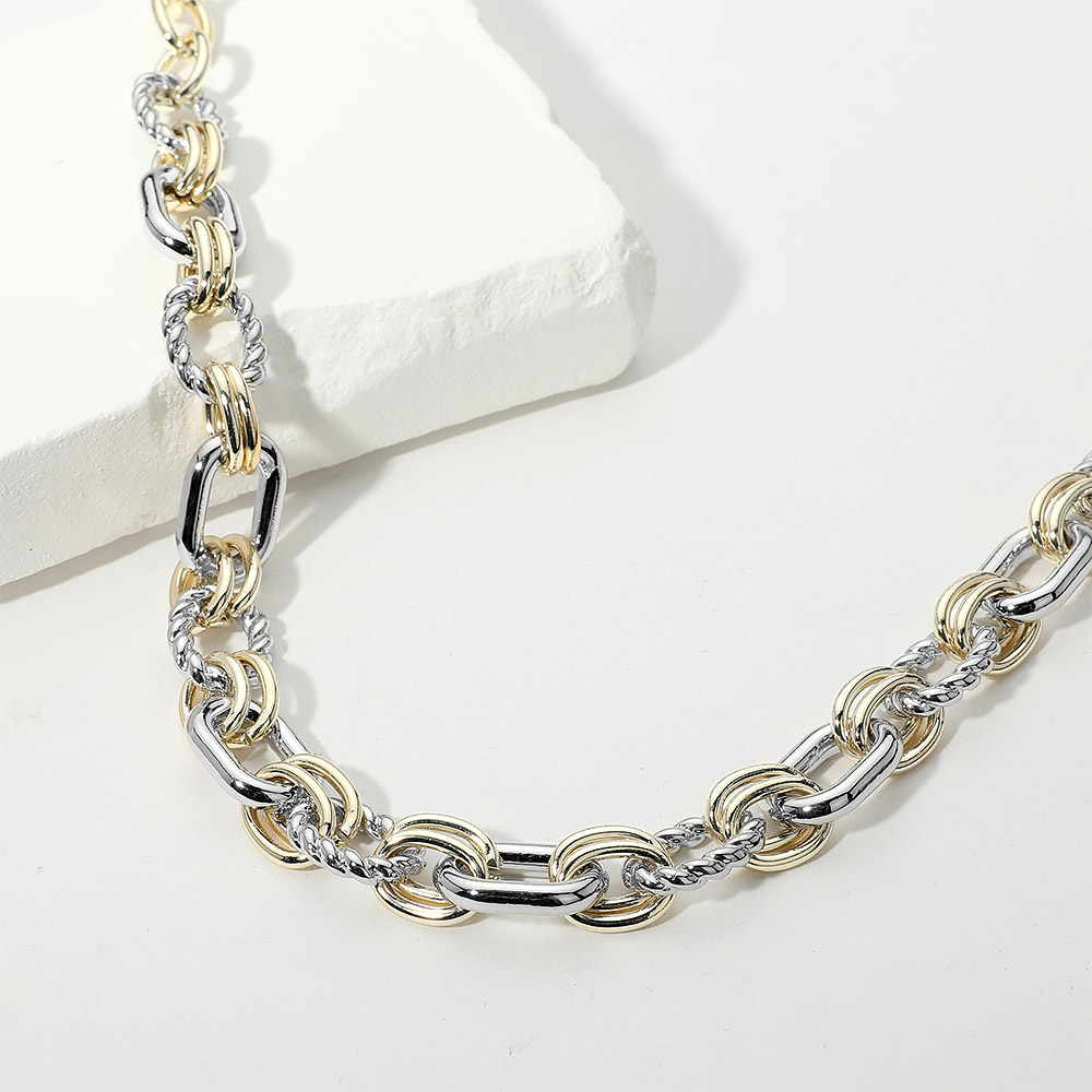 Details • Necklace Size : 17" + 2" L • Decor Size : 0.5" L • Stylish and versatile, this dual-tone mixed link chain necklace blends polished and twisted links for a unique, textured look. The secure clasp ensures comfortable wear, making it perfect for layering or as a statement piece to elevate both casual and dressy outfits. • Gold Dipped
