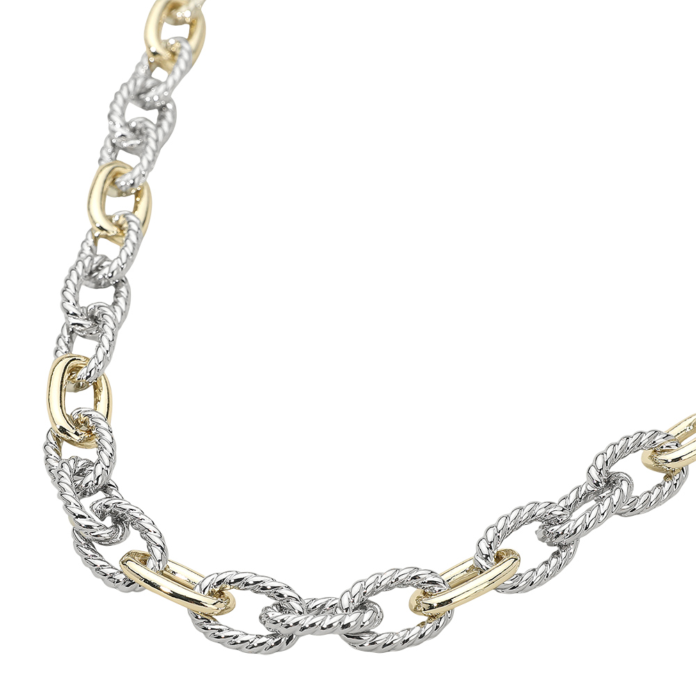 Details • Necklace Size : 16.75" L • Decor Size : 0.5" L • Magnetic Closure • A striking necklace featuring rope-textured oval links paired with smooth polished connectors for a bold two-tone effect. This chain design blends classic rope details with modern accents, perfect for layering or wearing solo as a statement piece. • Gold Dipped
