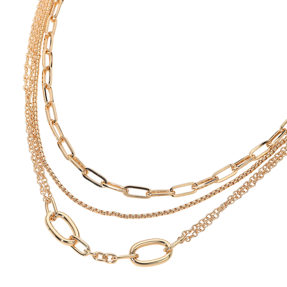 Details • Necklace 1 Size : 15.5" + 3.25" L, 0.75" L • Necklace 2 Size : 17" + 3.25" L, 0.4" L • Stylish layered chain necklace featuring mixed link designs for a bold yet elegant look. The multi-strand style adds texture and dimension, making it perfect for enhancing any casual or formal outfit with a touch of modern sophistication and effortless charm. • Lead and Nickel Compliant