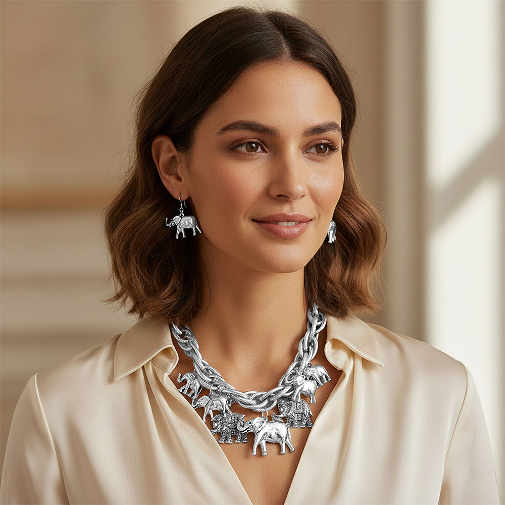 • Bold statement necklace featuring layered chain styling accented with detailed elephant charms and a coordinated drop earring pair. Designed to create visual impact, this playful yet elegant set adds character and charm to everyday outfits, themed looks, and special occasions with an eye-catching silhouette.