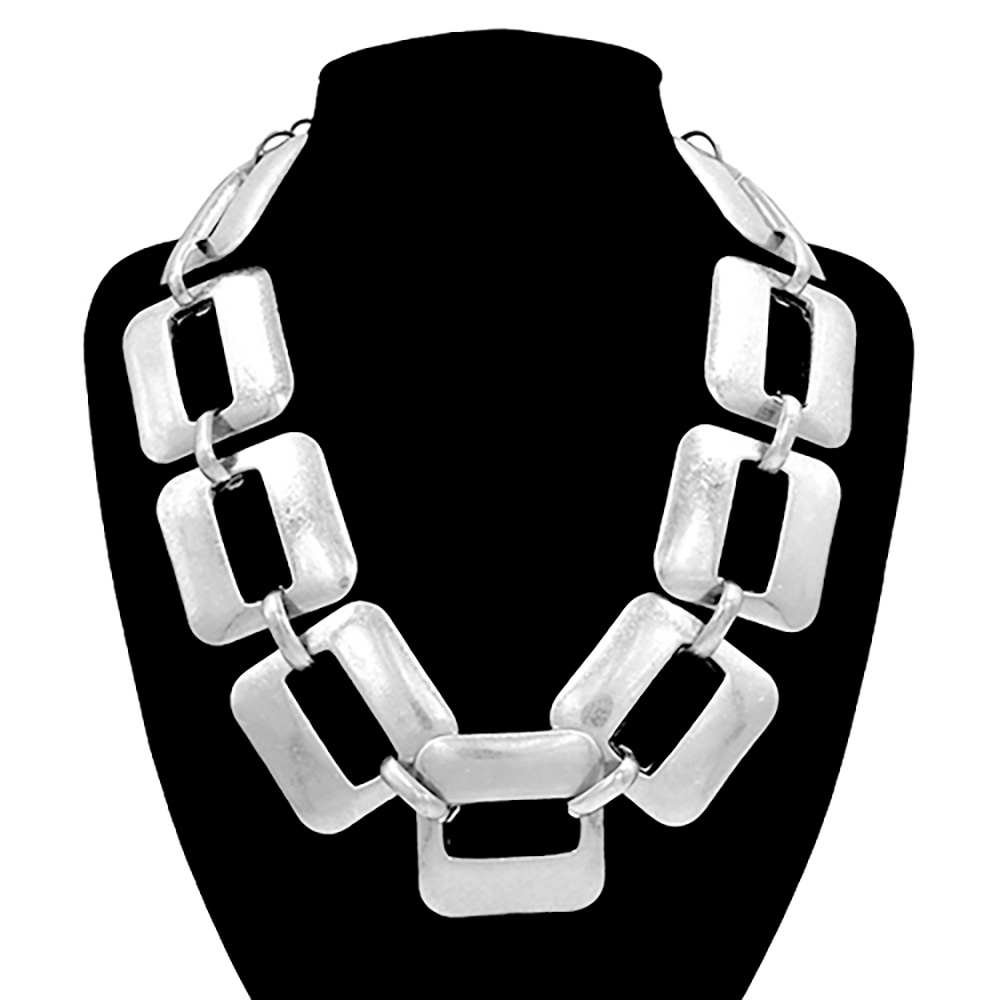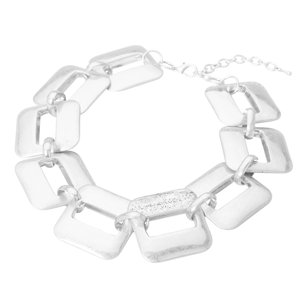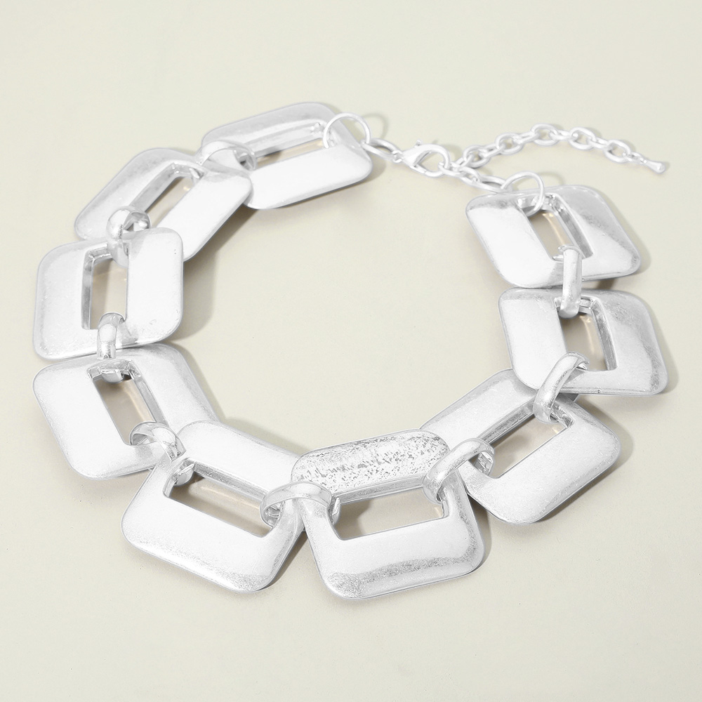 Details • Necklace Size : 18" + 4" L • Decor Size : 1.75" L • Add modern flair to your accessories with this geometric link bracelet featuring bold rectangular open links and a polished finish. Its contemporary design makes it versatile enough to pair with casual looks or elevate dressy outfits, giving you a chic and fashion-forward edge. • Lead and Nickel Compliant