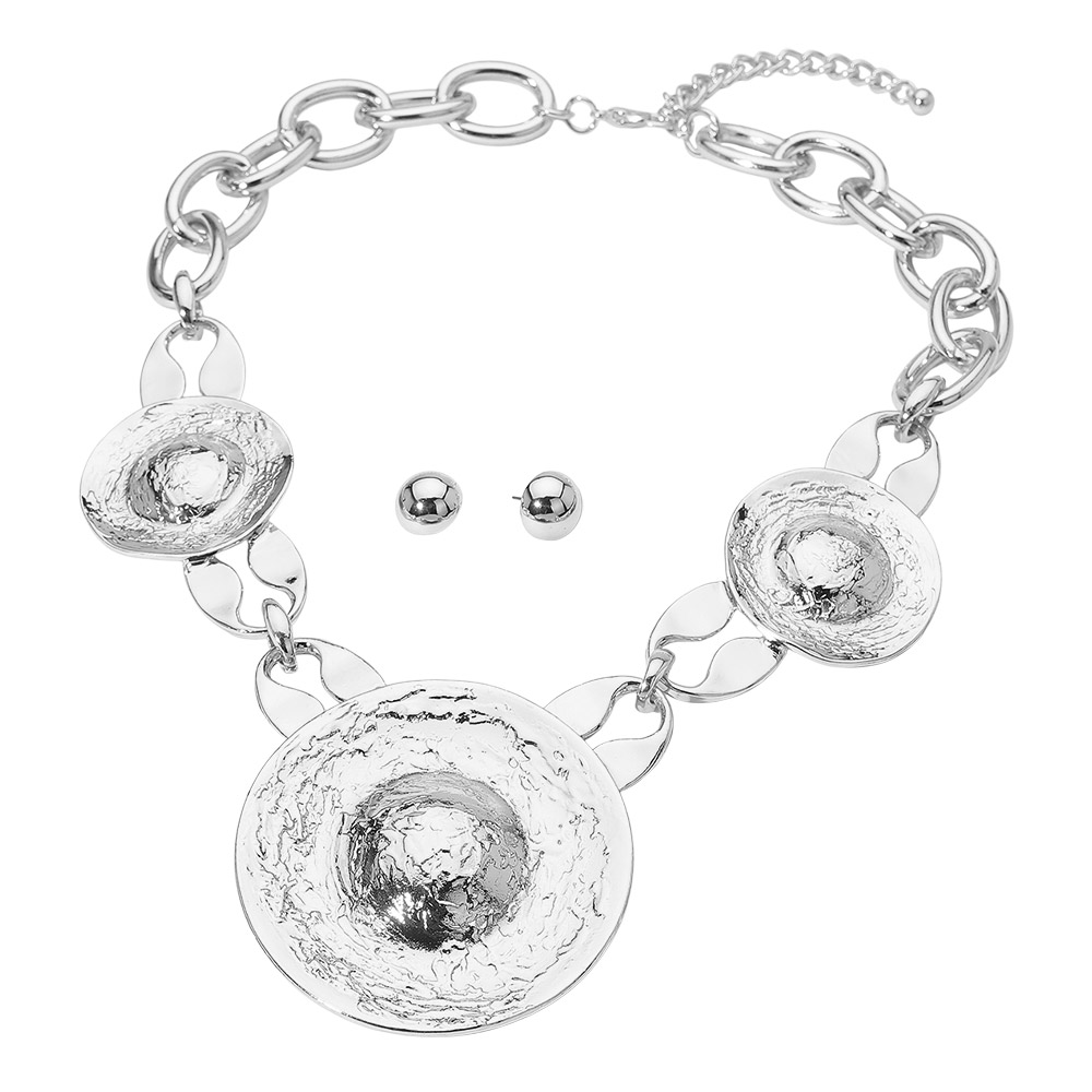 Details • Necklace Size : 22" + 3" L • Decor Size : 3" L • Earrings Size : 0.5" L • This hammered disc link necklace set showcases bold, circular pendants with a textured finish that reflects modern elegance. The chunky link chain adds a statement edge, while the matching stud earrings complete the coordinated look, perfect for refined or contemporary occasions. • Lead and Nickel Compliant