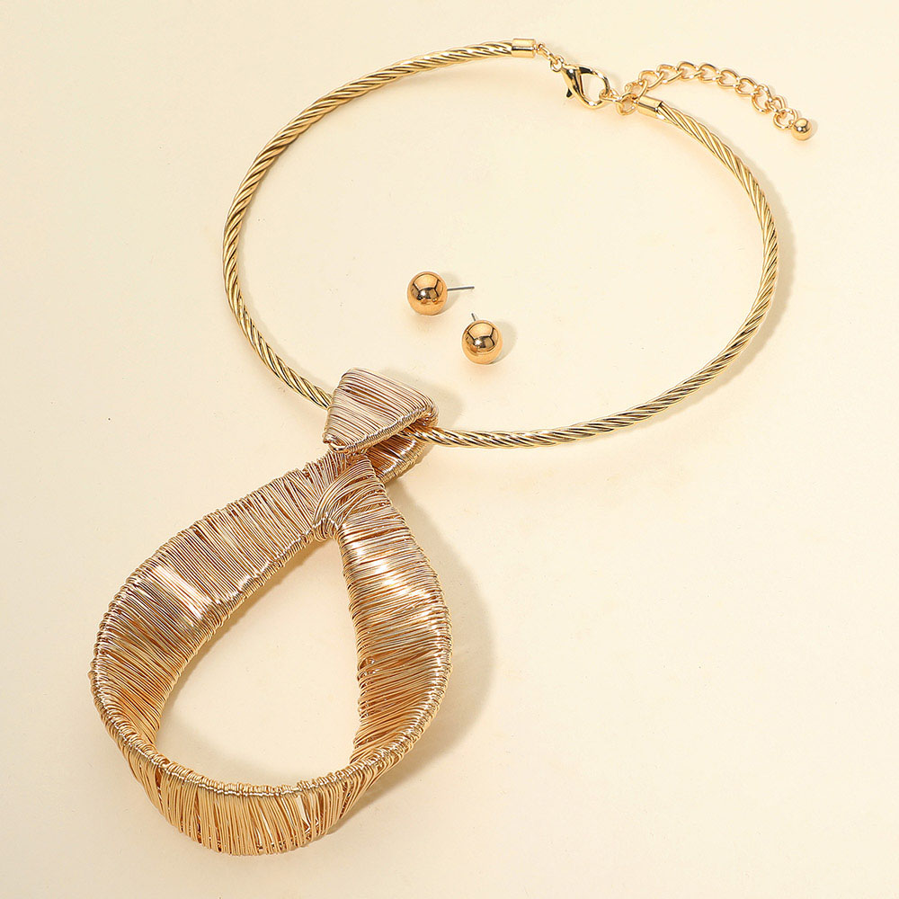 Details • Necklace Size : 18" + 3" L • Pendant Size : 3.75" X 6" • Earrings Size : 0.4" L • Showcase bold elegance with this teardrop pendant necklace paired with matching earrings. Featuring a textured open design and sleek finish, this modern jewelry set is perfect for making a statement, elevating both special occasion and everyday fashion effortlessly. • Lead and Nickel Compliant