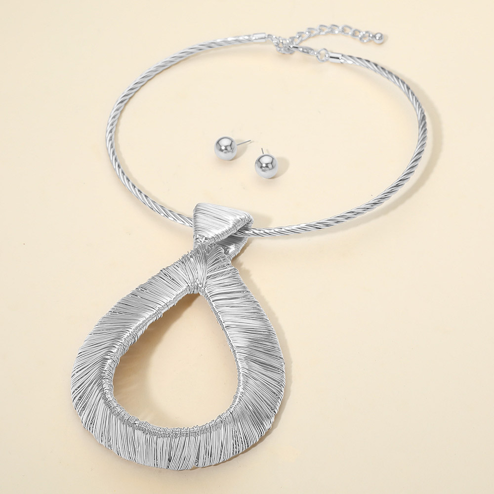 Details • Necklace Size : 18" + 3" L • Pendant Size : 3.75" X 6" • Earrings Size : 0.4" L • Showcase bold elegance with this teardrop pendant necklace paired with matching earrings. Featuring a textured open design and sleek finish, this modern jewelry set is perfect for making a statement, elevating both special occasion and everyday fashion effortlessly. • Lead and Nickel Compliant