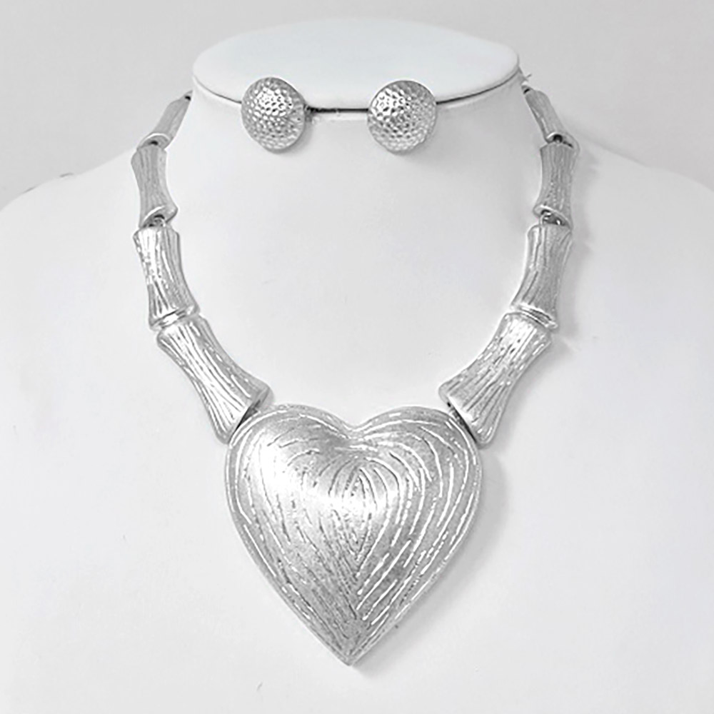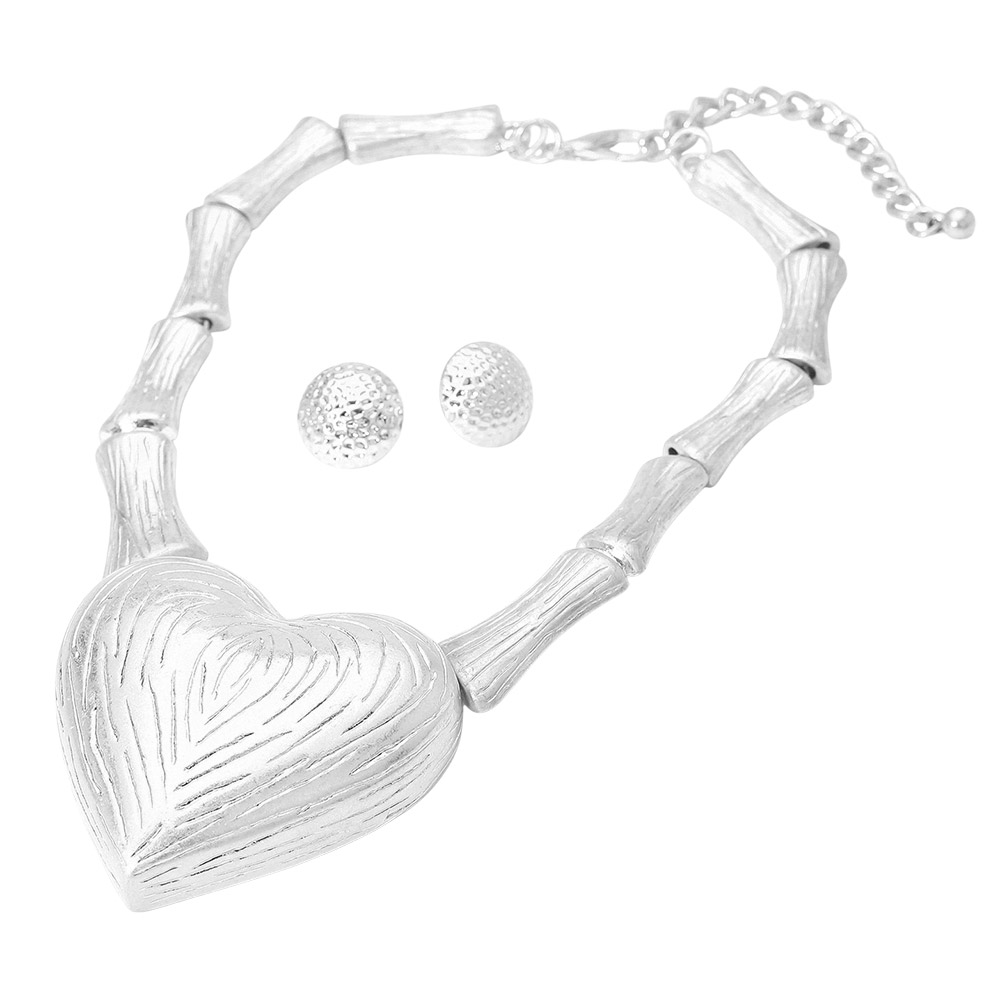 Bold Textured Metal Heart Accent Bamboo Link Statement Necklace