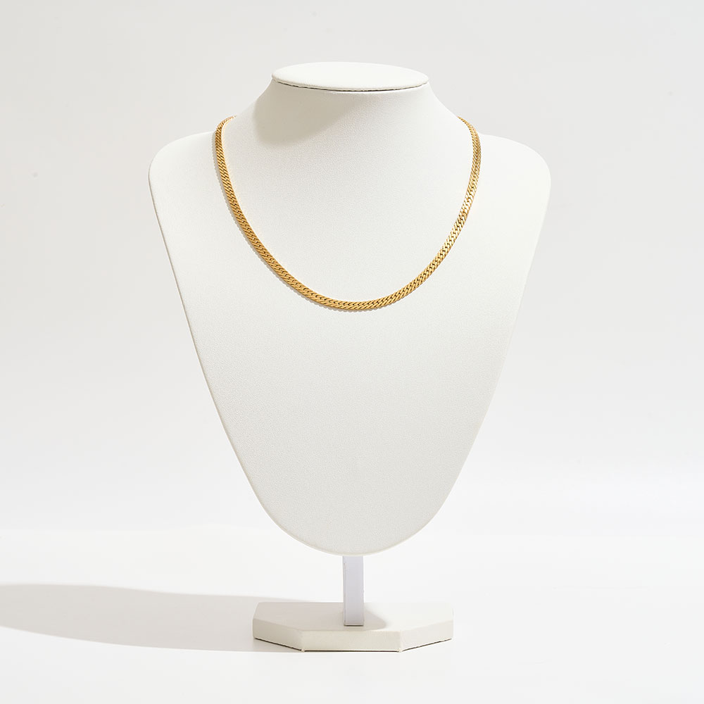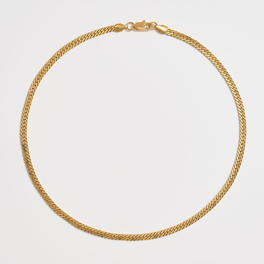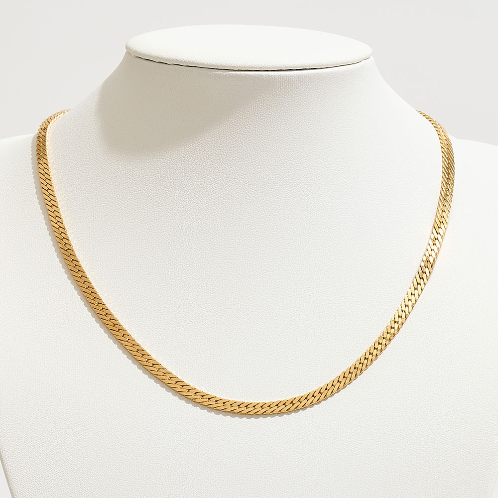 Details • Necklace Size : 18" + 1" L • Decor Size : 0.25" L • This flat herringbone chain necklace offers a sleek and polished look, perfect for everyday wear or layering with other chains. Crafted from durable brass, its smooth and fluid design adds a refined touch, making it an essential accessory for modern styling. • Brass • Gold Dipped • Hypoallergenic • Made In Korea