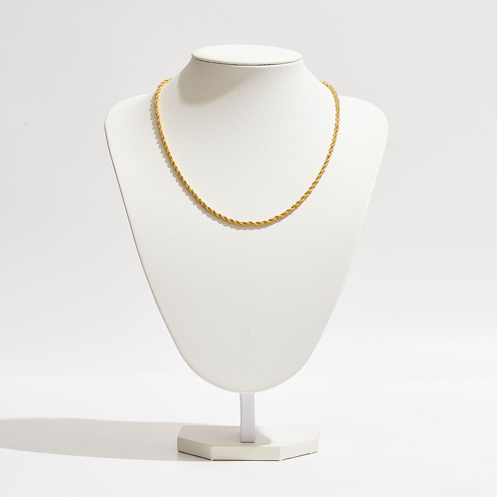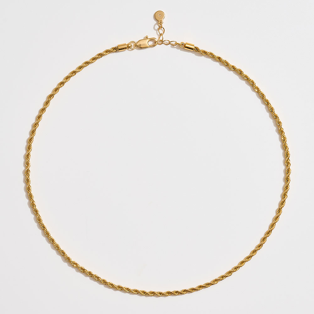 Details • Necklace Size : 18" + 1" L • Decor Size : 0.2" L • Elevate your look with this slim rope chain necklace featuring delicate twisted links for a refined touch. Lightweight and versatile, it’s perfect for layering with other pieces or wearing alone for a subtle statement, making it an everyday essential for effortless style. • Brass • Gold Dipped • Made In Korea