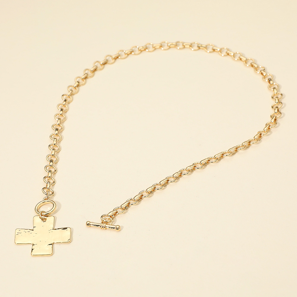 Hammered Metal Cross Pendant Chunky Chain Toggle Necklace