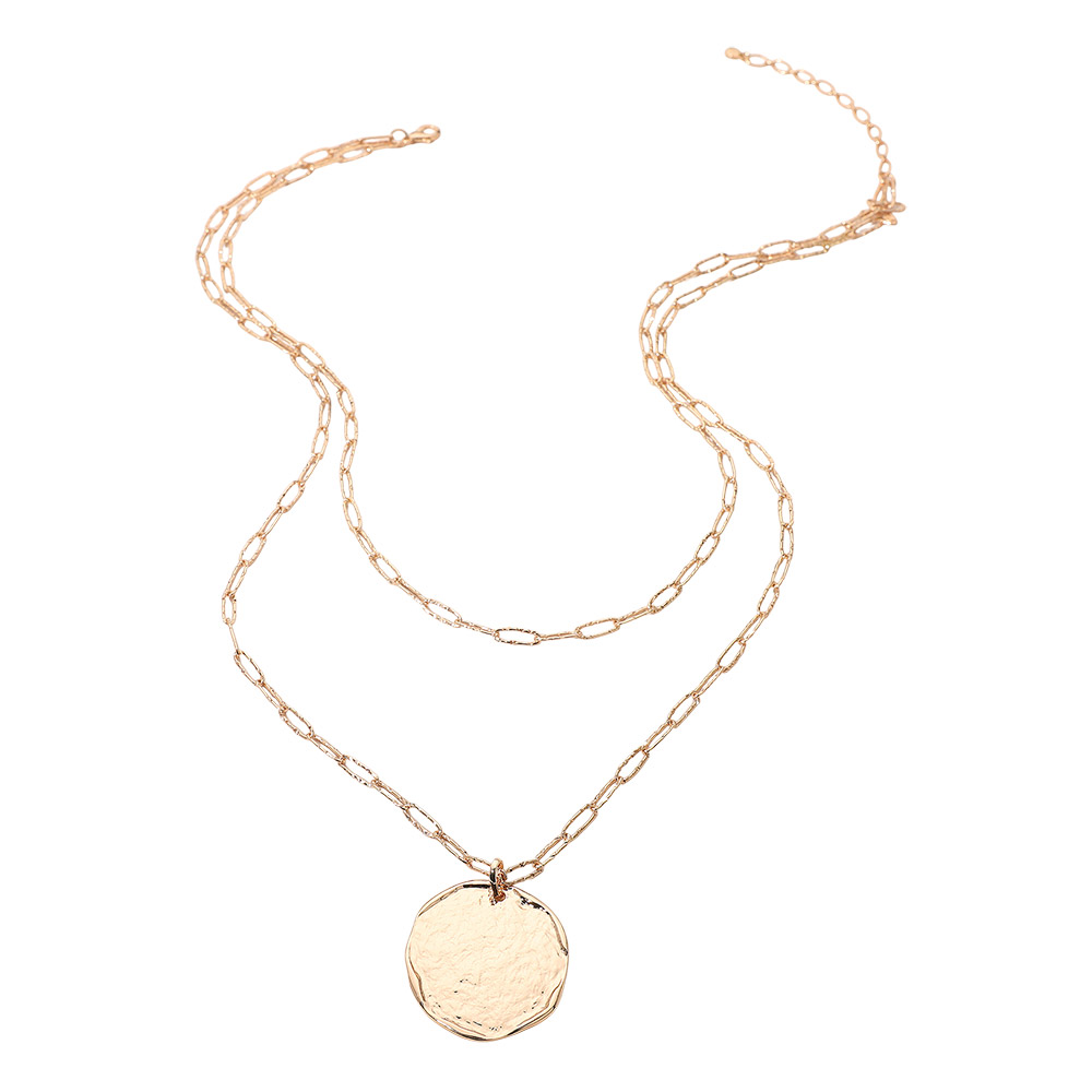 Details • Necklace Size : 20.5" +3" L • Decor Size : 5.5" L • Earrings Size : 1.5" X 1.6" • Stylish layered pendant necklace featuring two delicate link chains with a hammered disc charm. Its elegant yet minimal design adds a modern touch to everyday wear, perfect for layering or as a statement accessory for both casual and dressy looks. • Lead and Nickel Compliant