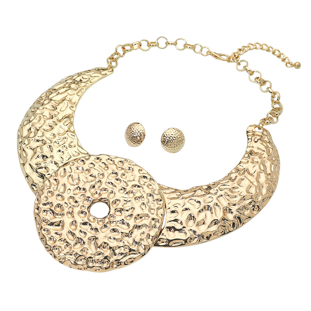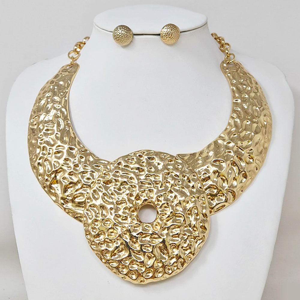 • Elevate your look with this hammered statement collar necklace and matching earrings. Featuring bold, sculpted textures and a striking circular centerpiece, this set exudes modern elegance—perfect for adding a touch of artistic sophistication to any outfit.