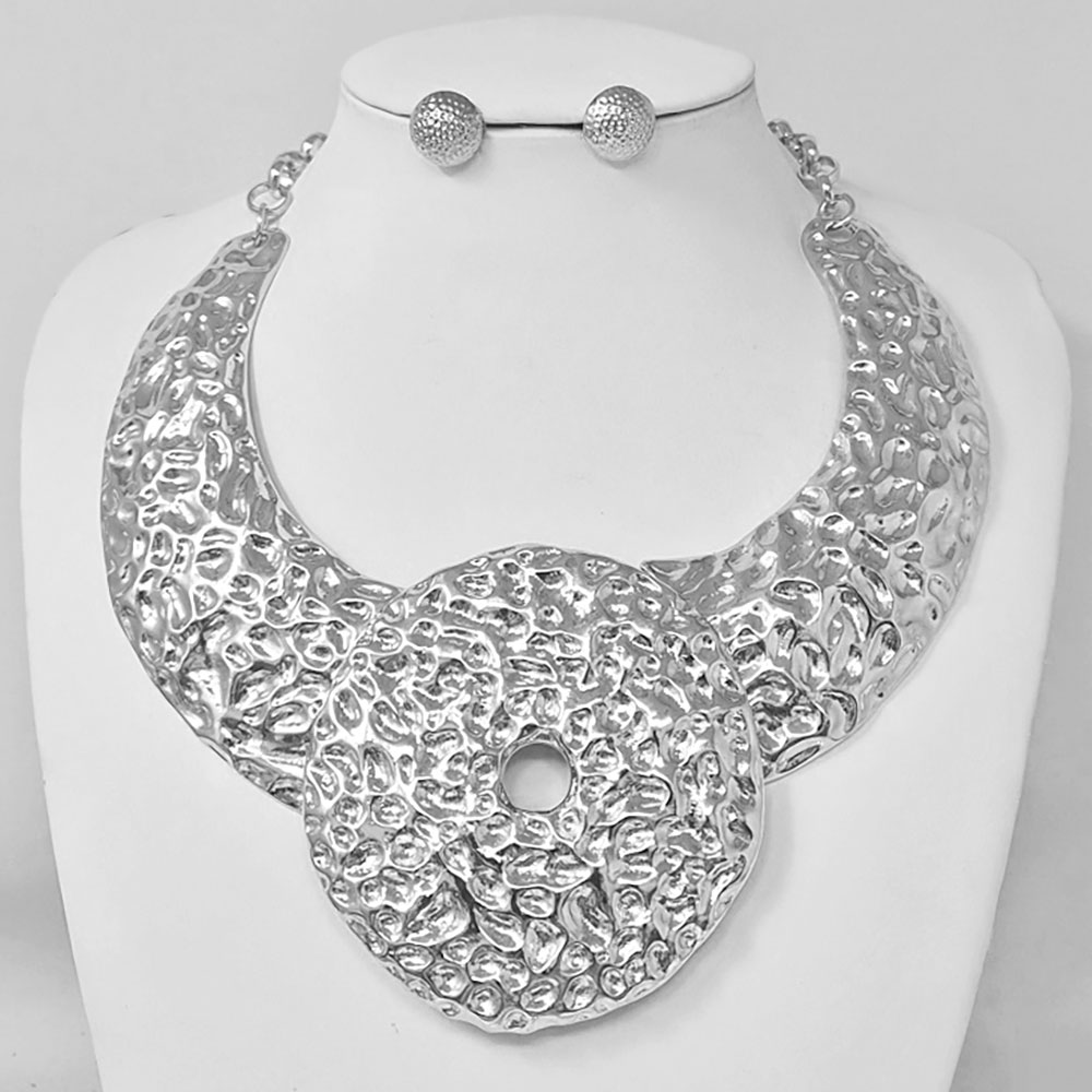 Details • Necklace Size : 19" + 3" L • Decor Size : 3.5" L • Earrings Size : 0.7" L • Elevate your look with this hammered statement collar necklace and matching earrings. Featuring bold, sculpted textures and a striking circular centerpiece, this set exudes modern elegance—perfect for adding a touch of artistic sophistication to any outfit. • Lead and Nickel Compliant
