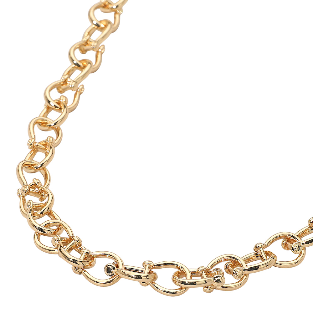 Details • Necklace Size : 16" + 3.5" L • Decor Size : 0.5" L • Make a bold yet refined impression with this elegant interlocking chain necklace. Its intricate looped design adds sophistication to any outfit, making it the perfect accessory for both casual and formal looks. Ideal for layering or wearing solo as a timeless statement piece. • Lead and Nickel Compliant