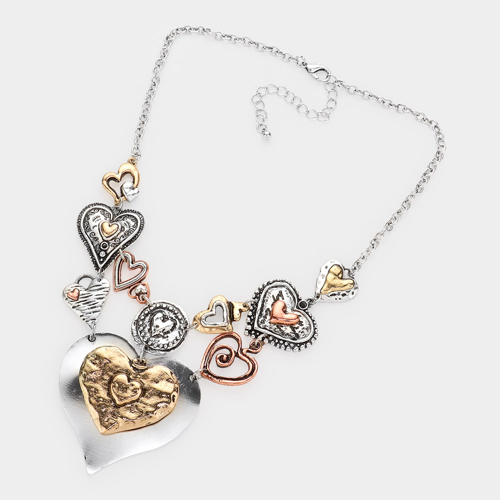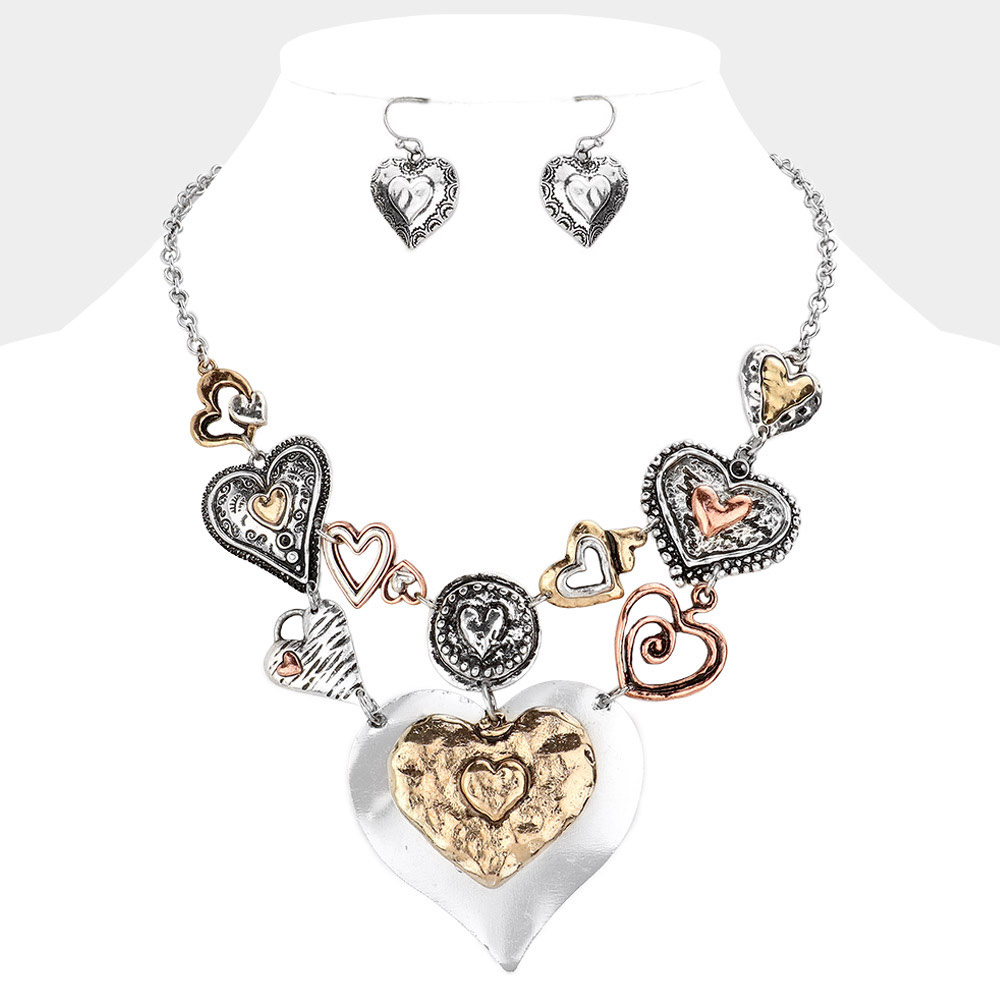 Details • Necklace Size : 17" + 3" L • Decor Size : 2.8" L • Earring Size : 1.2" L • Bold necklace featuring assorted heart-shaped charms in mixed metal textures and finishes, paired with matching drop earrings. A unique statement set perfect for adding artistic flair to any ensemble. • Lead and Nickel Compliant