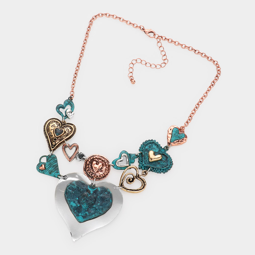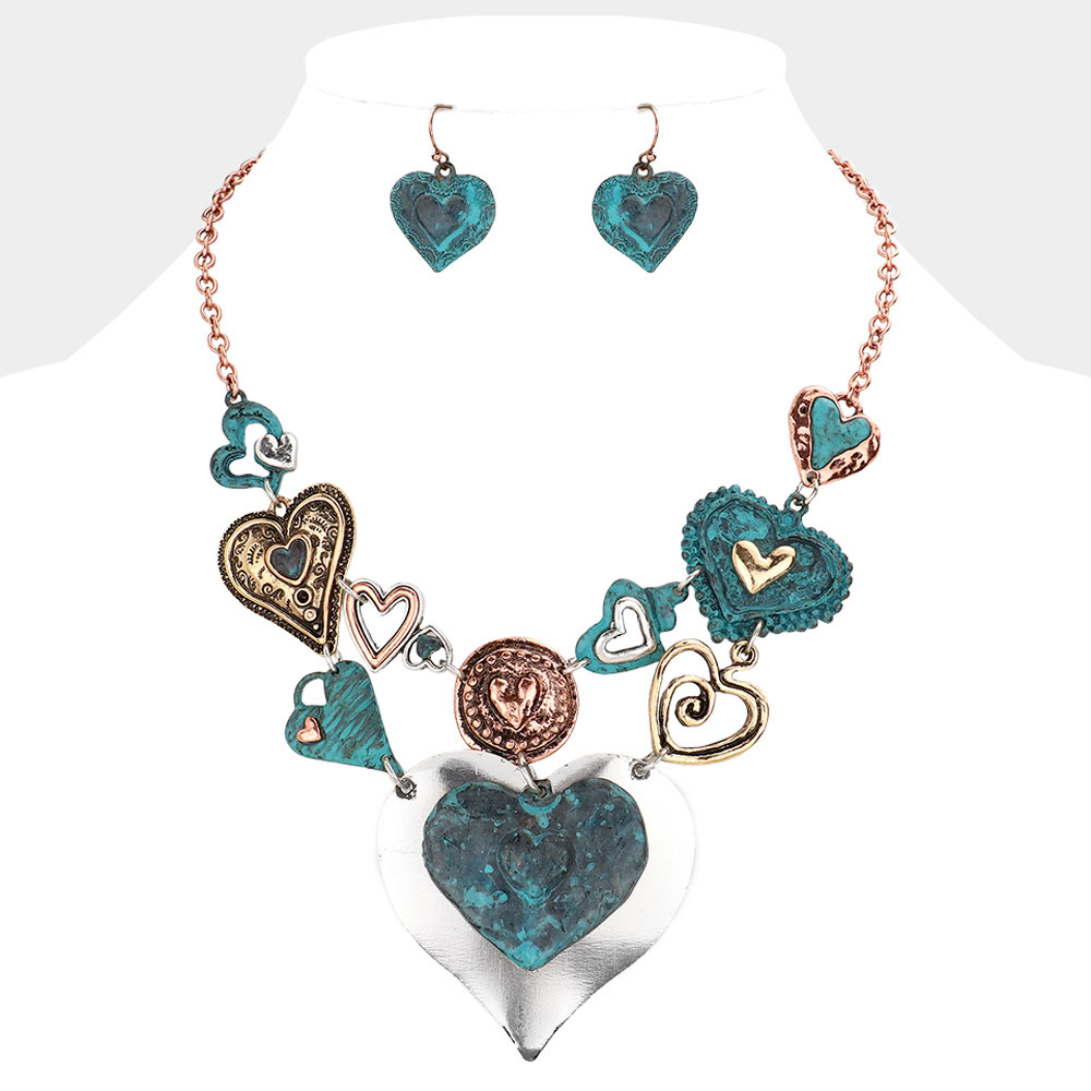 Details • Necklace Size : 17" + 3" L • Decor Size : 2.8" L • Earring Size : 1.2" L • Bold necklace featuring assorted heart-shaped charms in mixed metal textures and finishes, paired with matching drop earrings. A unique statement set perfect for adding artistic flair to any ensemble. • Lead and Nickel Compliant