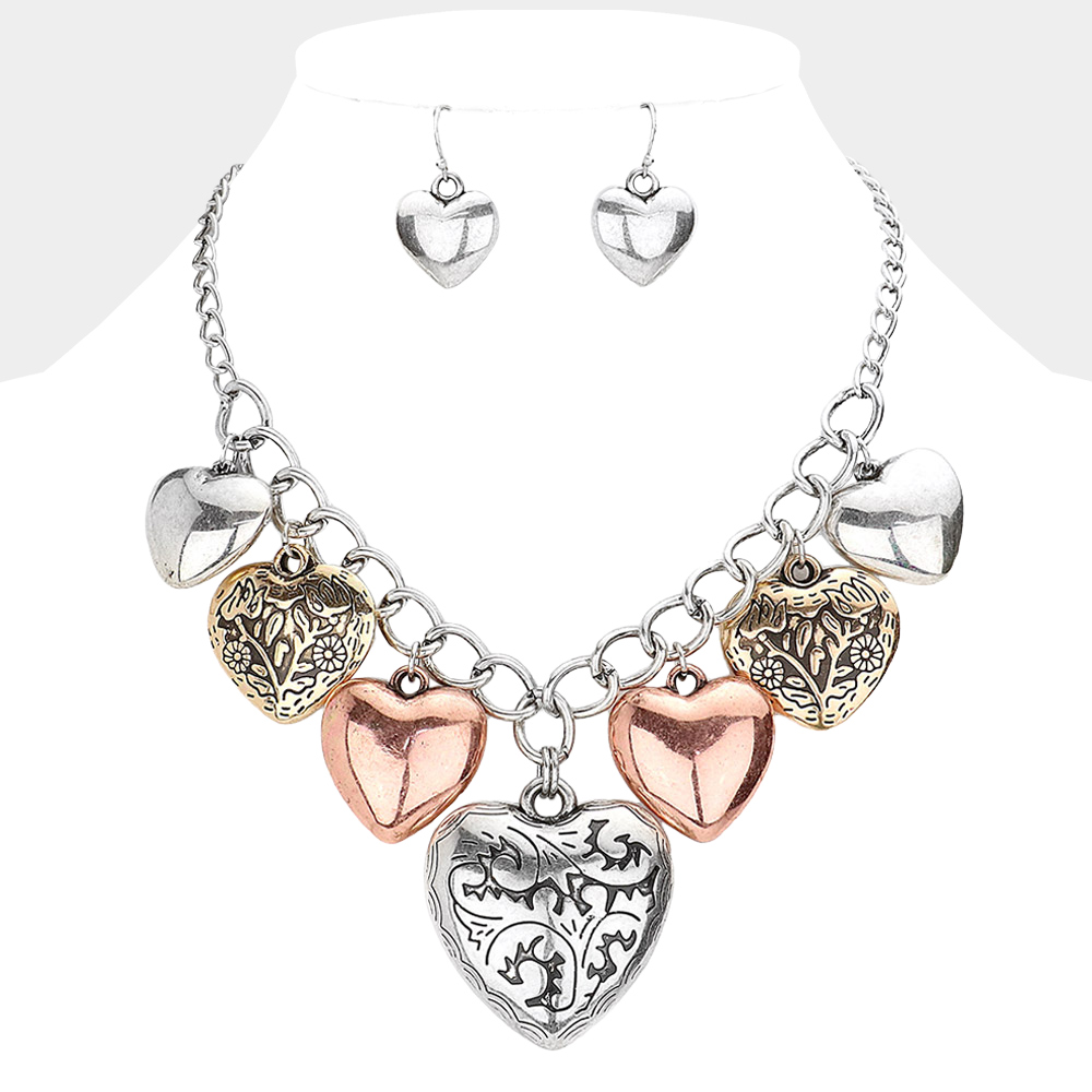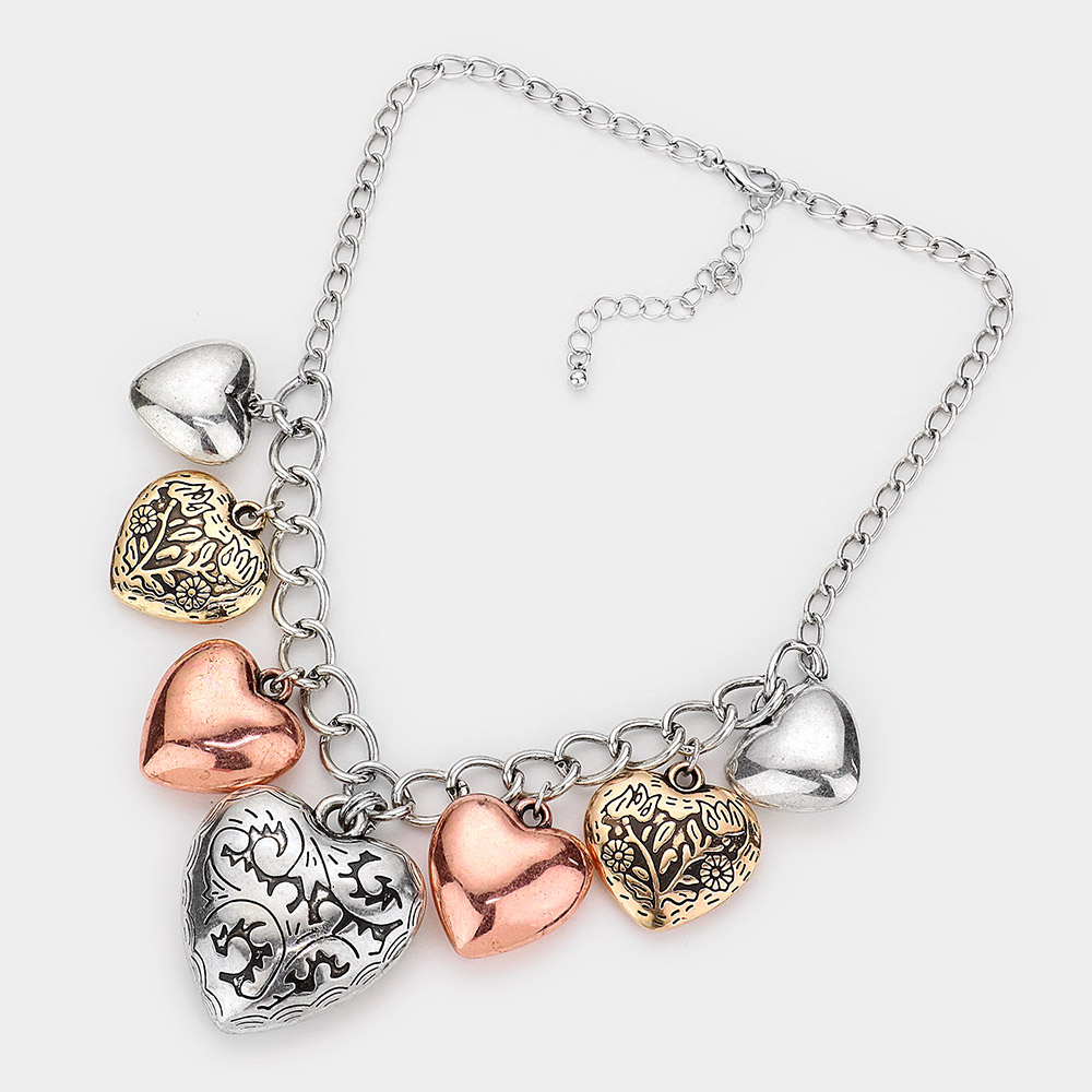 Enamel Flower Stone Paved Heart Hammered Metal Charm Station Paperclip Chain Necklace