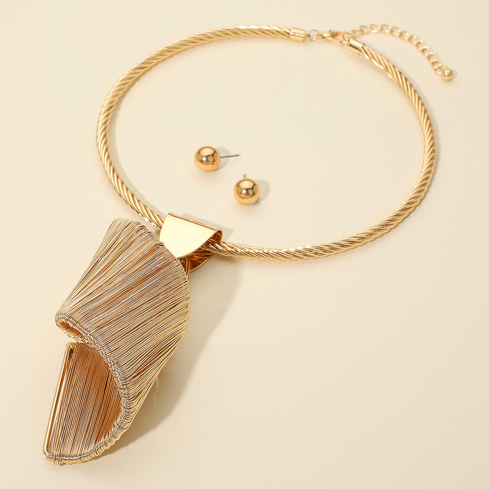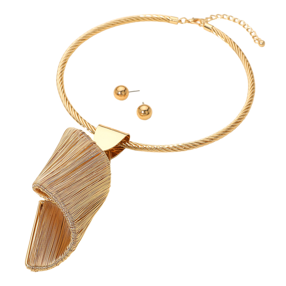 Details • Necklace Size : 18.5" + 3.5" L • Decor Size : 5.25" L • Earrings Size : 0.5" L • Bold statement necklace featuring a unique wire-textured abstract pendant paired with matching stud earrings. Designed to elevate any look with artistic flair, this jewelry set is perfect for formal events, evening outings, or adding modern sophistication to your everyday wardrobe. • Lead and Nickel Compliant