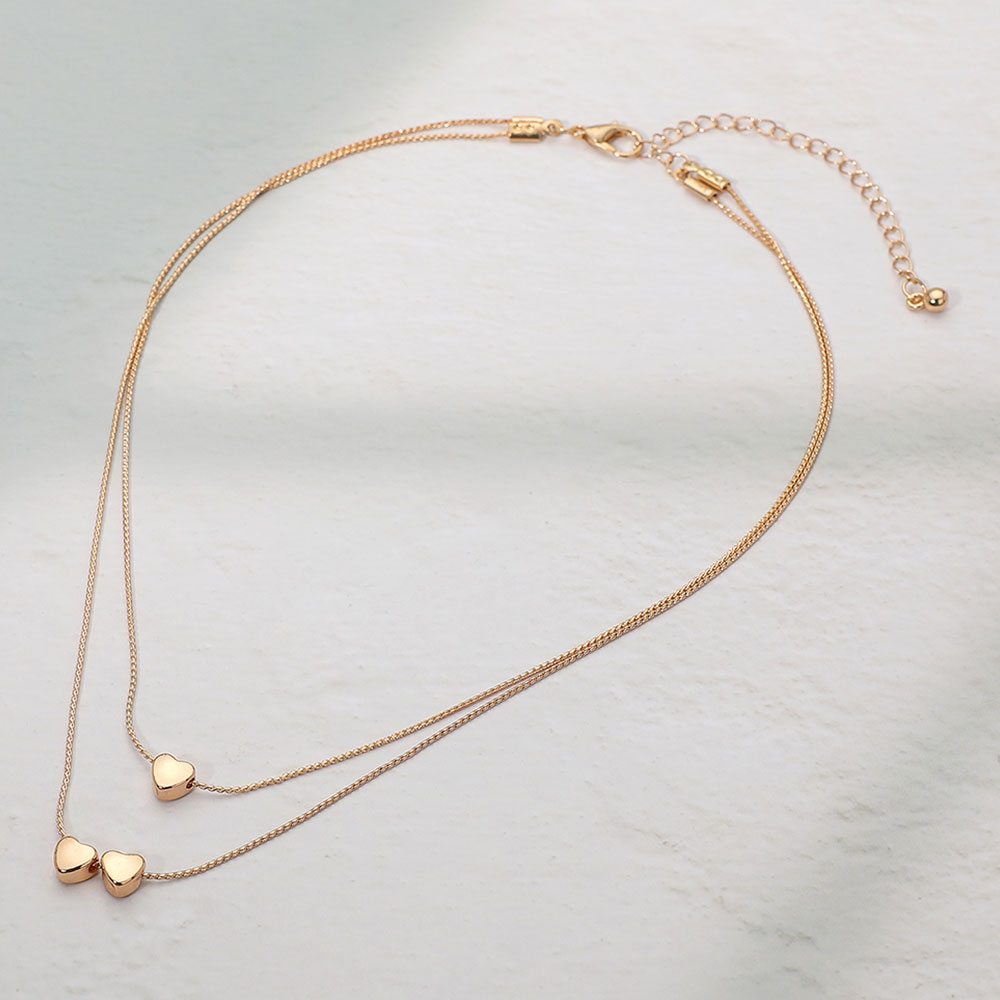 Details • Necklace Size : 14.5" + 3.25" L • Decor Size : 0.8" L • Elegant layered heart necklace featuring dual chains with petite heart charms for a delicate, romantic look. Perfect for everyday elegance or special occasions, this dainty design adds a touch of charm and love-inspired sophistication to any outfit. • Lead and Nickel Compliant