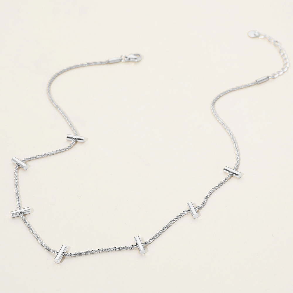 Details • Necklace Size : 16" + 2" L • Decor Size : 0.4" L • Water Resistant • Add subtle sophistication to your look with this modern tube bar necklace, featuring a sleek arrangement of small cylindrical accents on a refined chain. Perfect for both everyday wear and elegant occasions, this versatile piece complements any minimalist jewelry collection. • Hypoallergenic • Stainless Steel