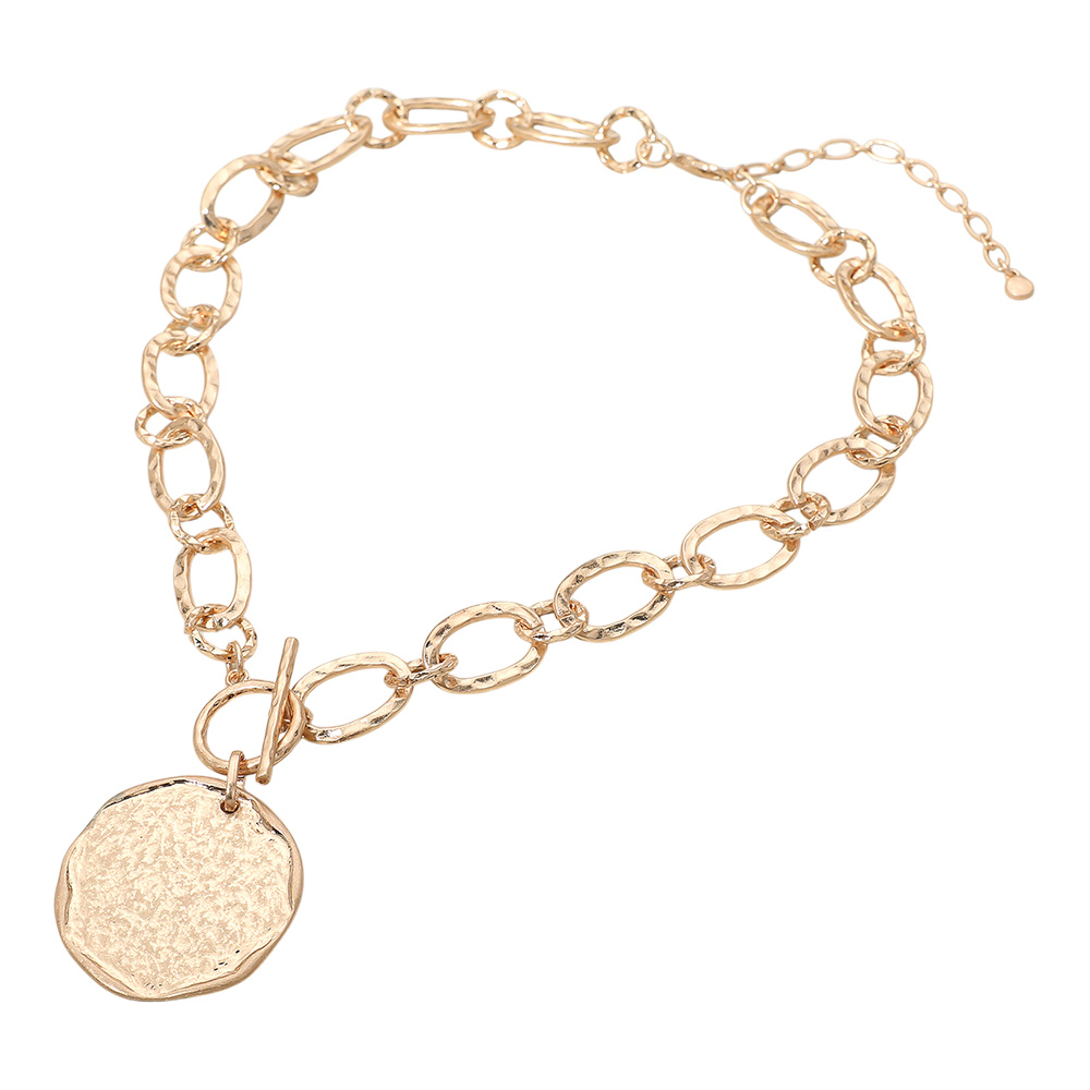 Details • Necklace Size : 17" + 3.5" L • Decor Size : 1.8" L • Make a bold statement with this chunky link chain necklace featuring a hammered disc pendant. The textured finish adds modern edge while the toggle clasp ensures easy wear. Perfect for layering or as a standalone piece, it enhances casual and elegant outfits alike. • Lead and Nickel Compliant