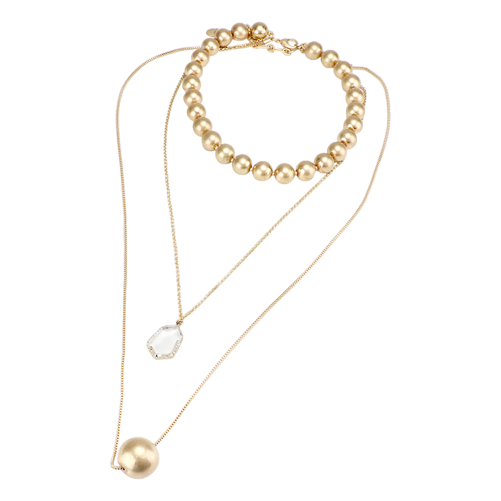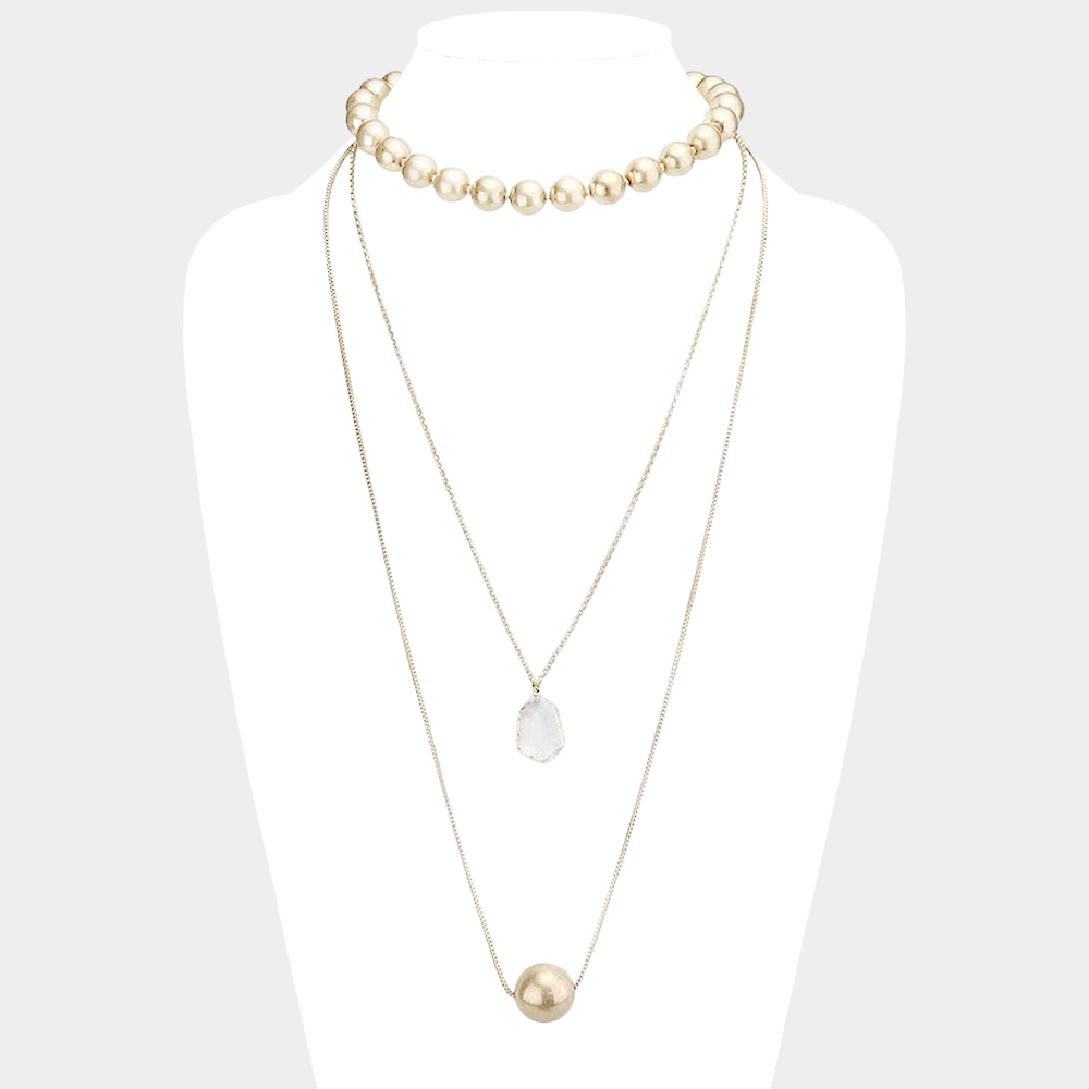 Triple Layered Clear Hexagon Metal Ball Pendant Necklace