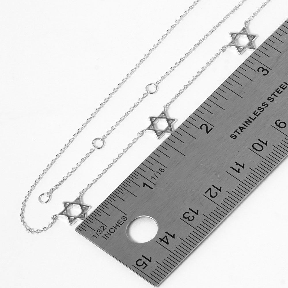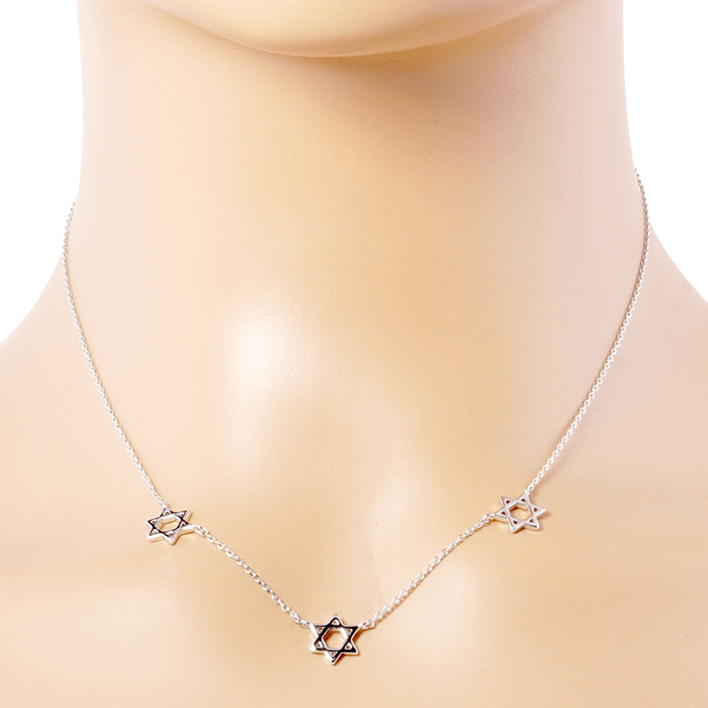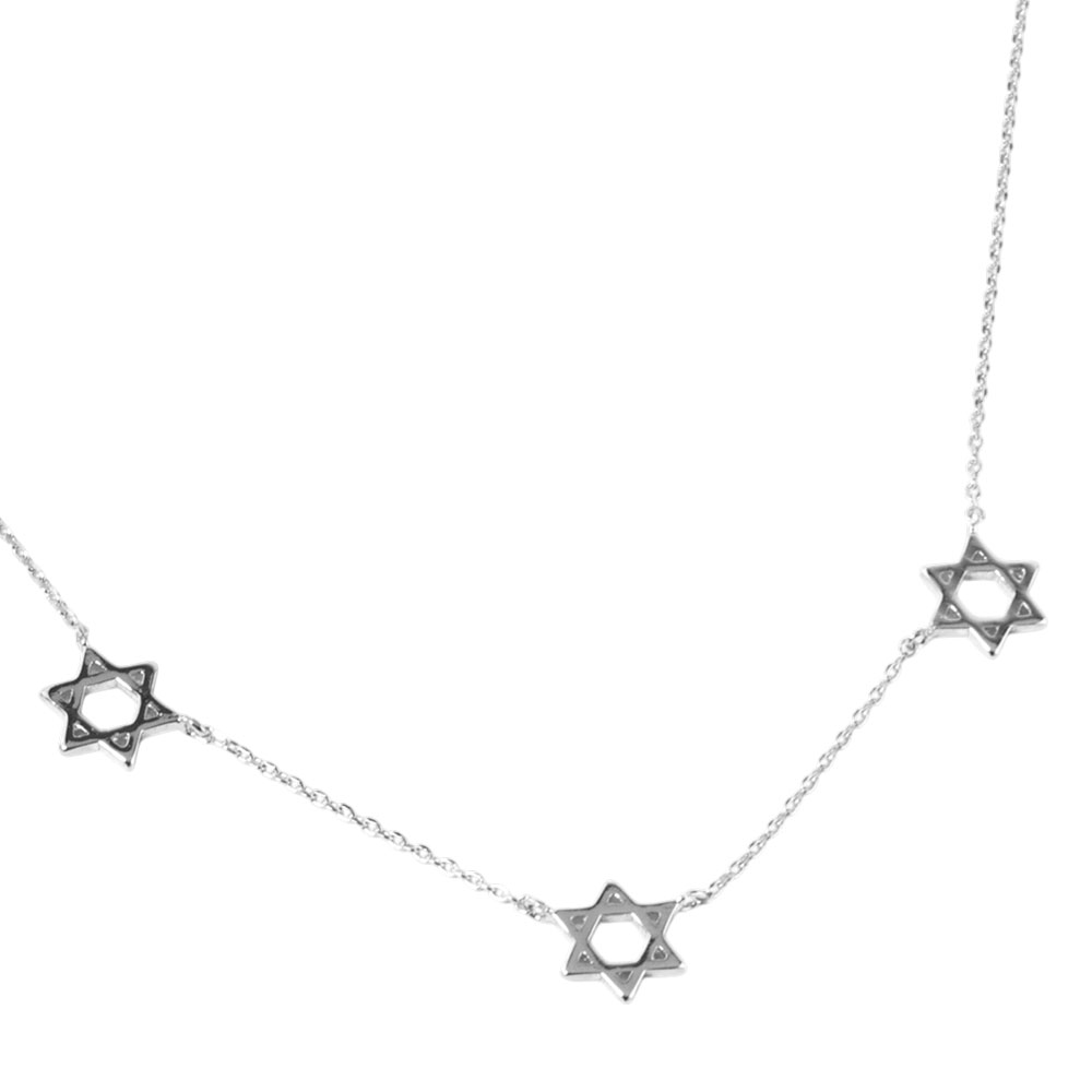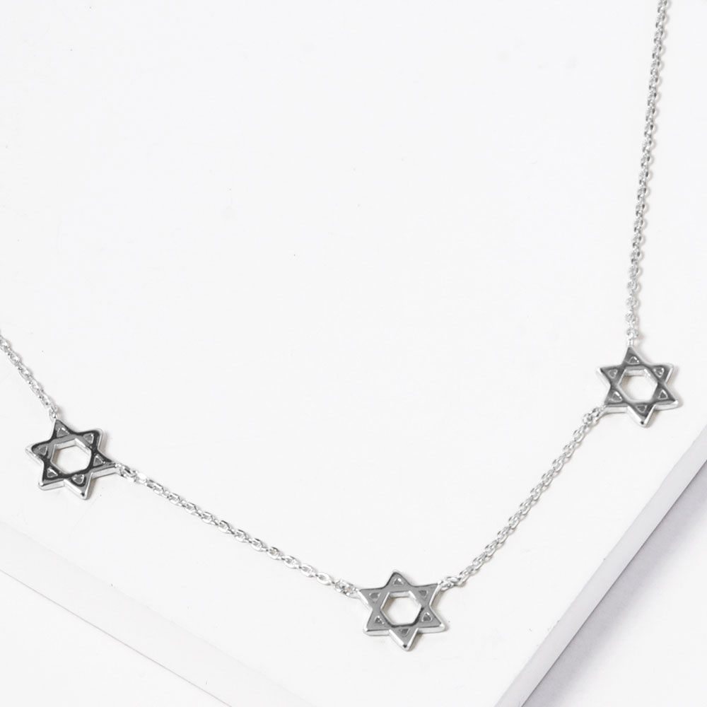Details • Necklace Size : 15.5" + 2" L • Decor Size : 0.4" L • Elegant necklace featuring three Star of David charms on a delicate chain. A meaningful and stylish accessory perfect for everyday wear or gifting during special occasions and cultural celebrations. • Gold Dipped • Lead and Nickel Compliant • Made In Korea