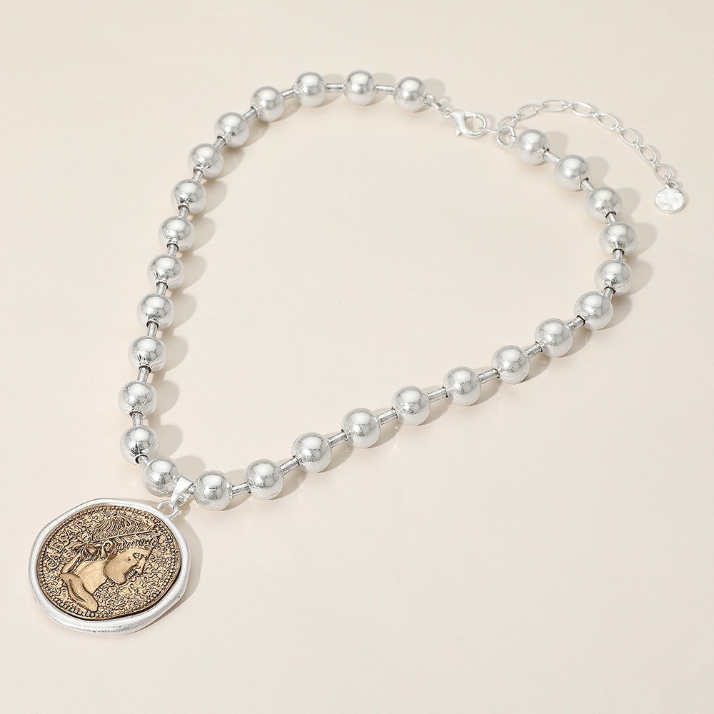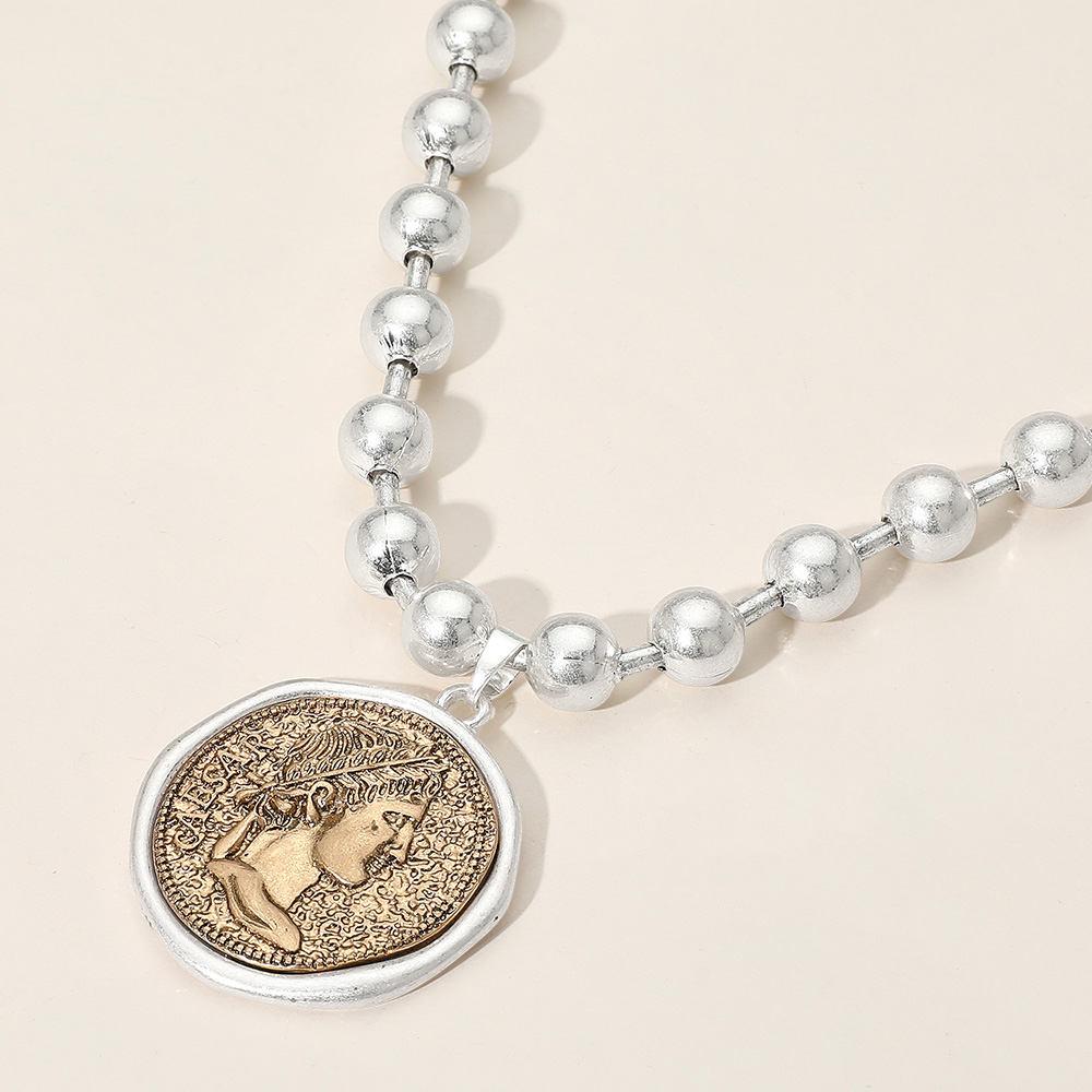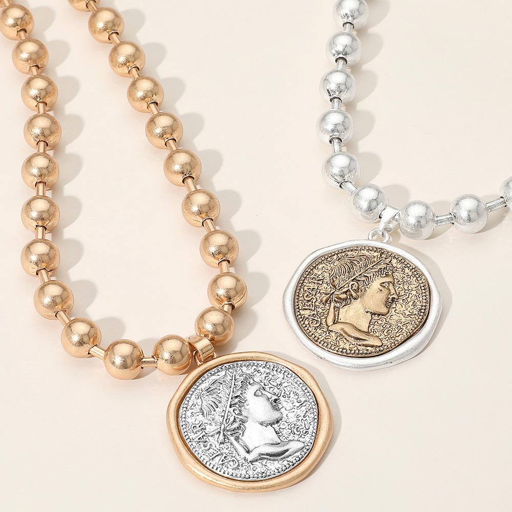 Worn Metal Roman Caesar Medal Pendant Beaded Necklace