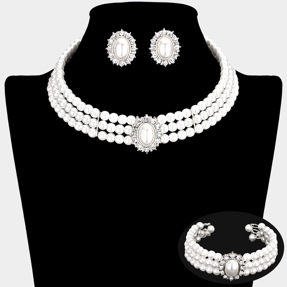 3PCS - Rhinestone Trimmed Pearl Necklace Jewelry Set