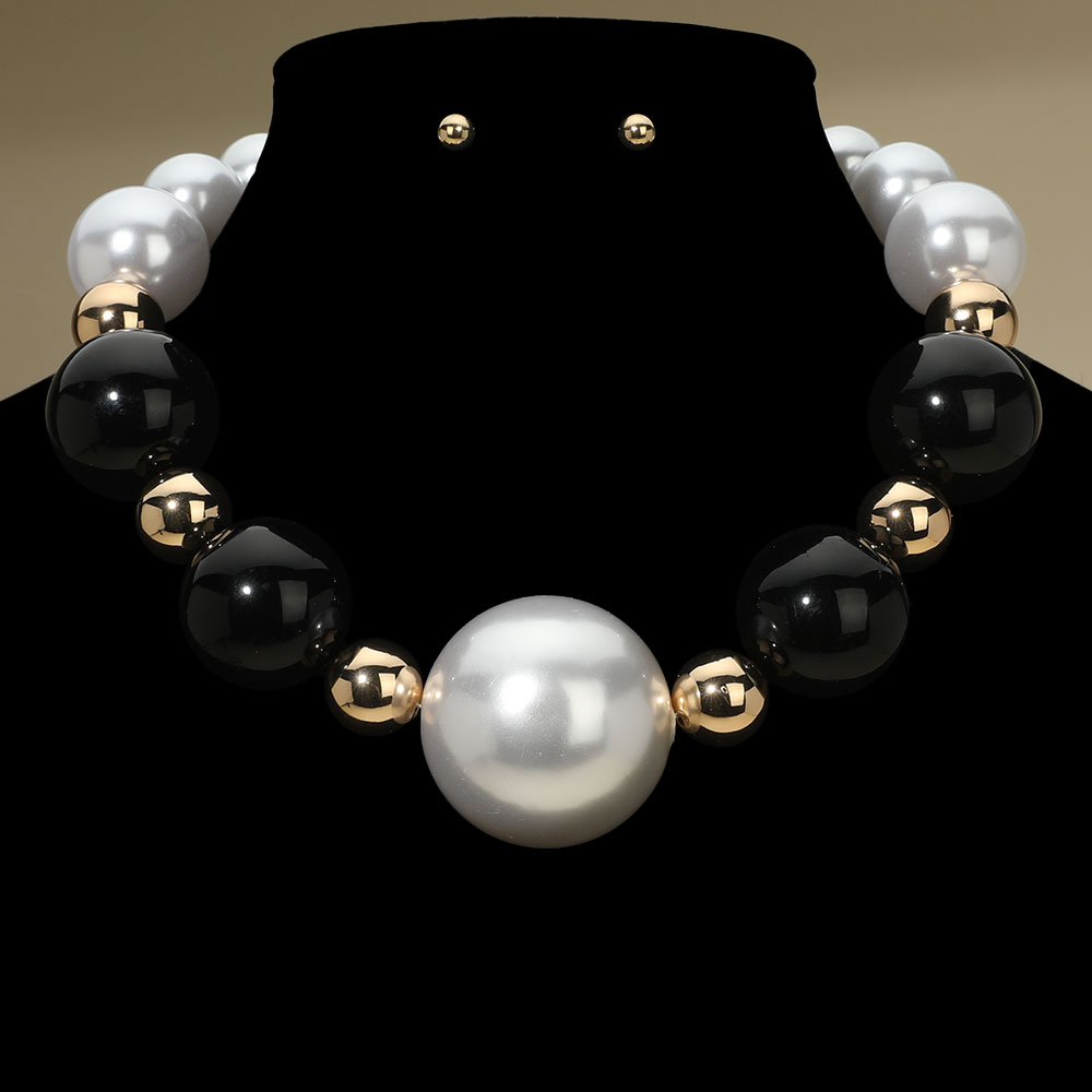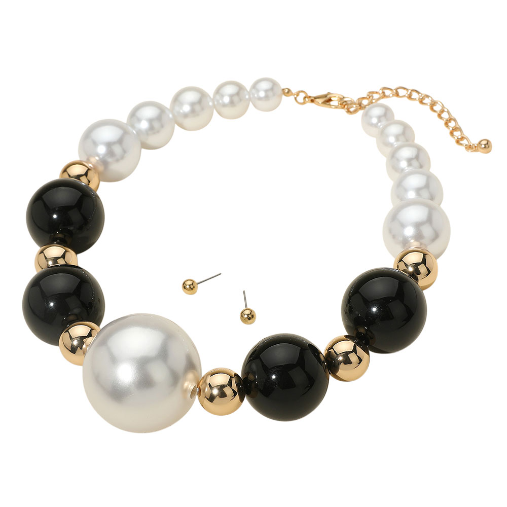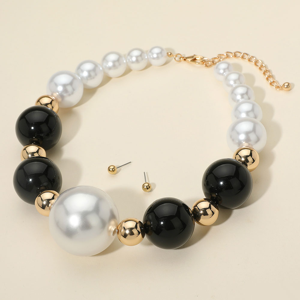 Details • Necklace Size : 18" + 3" L • Decor Size : 1.5" L • Earrings Size : 0.25" L • Make a stylish statement with this modern beaded necklace and matching stud earrings. Featuring a dynamic mix of bead sizes, this versatile jewelry set adds a bold, elegant edge to any outfit. Perfect for special events, evening looks, or elevated everyday style. • Lead and Nickel Compliant