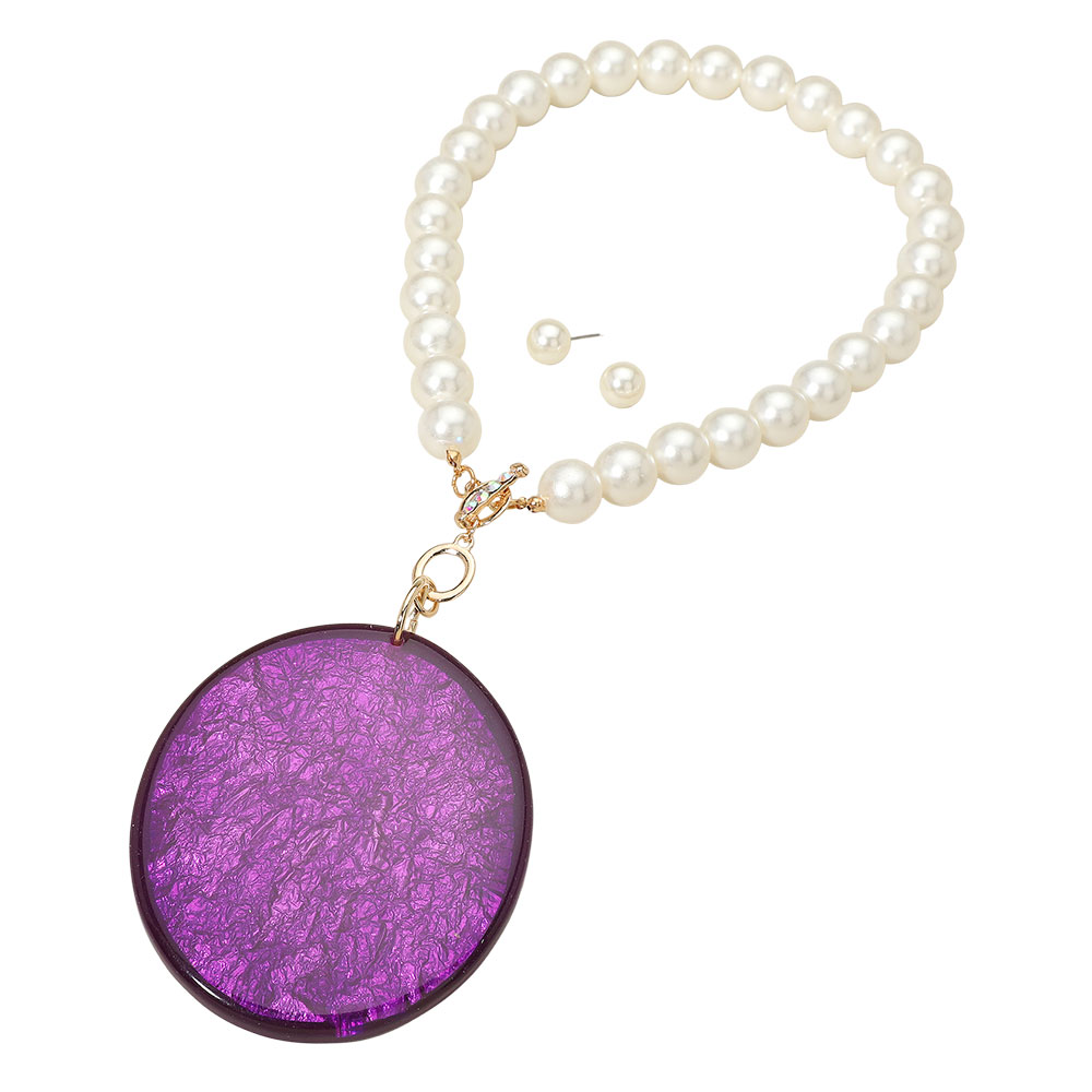 Bold Oval Resin Plate Pendant Accent Chunky Pearl Beaded Statement Necklace