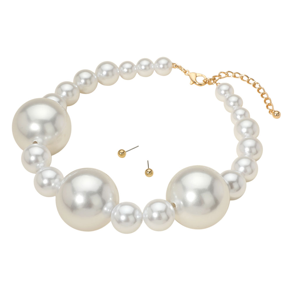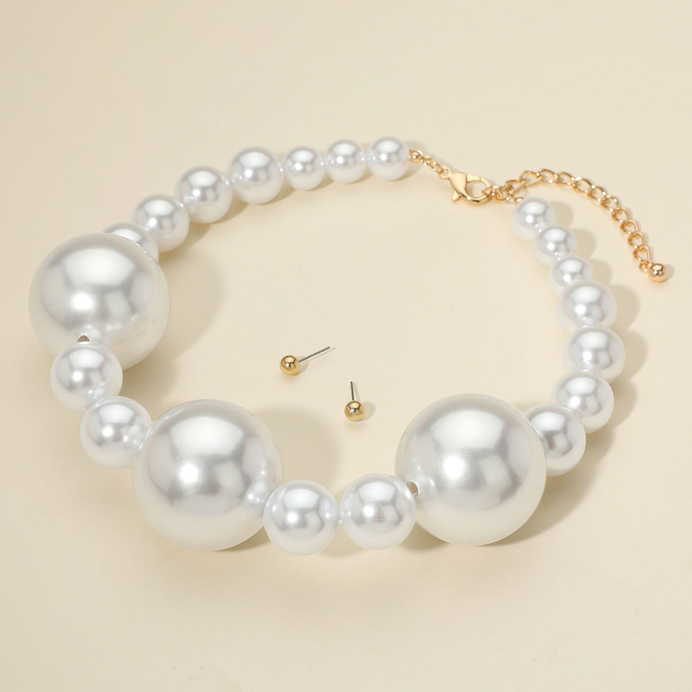 Details • Necklace Size : 18" + 3" L • Decor Size : 1.5" L • Earrings Size : 0.25" L • Add timeless elegance with this oversized faux pearl necklace and matching stud earrings. Featuring large statement beads on a delicate chain, this jewelry set enhances wedding styles, evening looks, and party outfits with a touch of classic sophistication and modern glamour. • Lead and Nickel Compliant