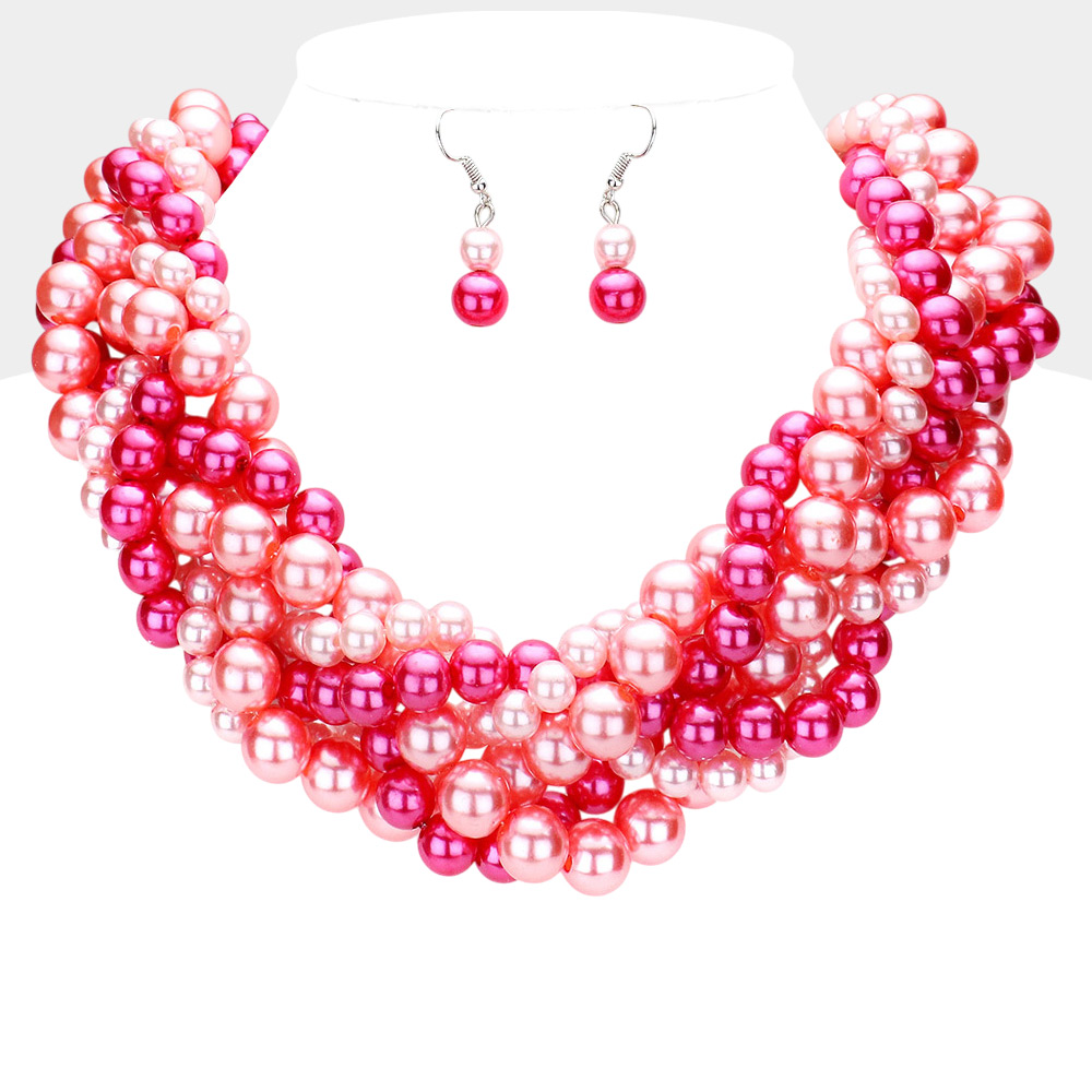 Crystal Rhinestone Paved Flower Bloom Pearl Triple Strand Necklace