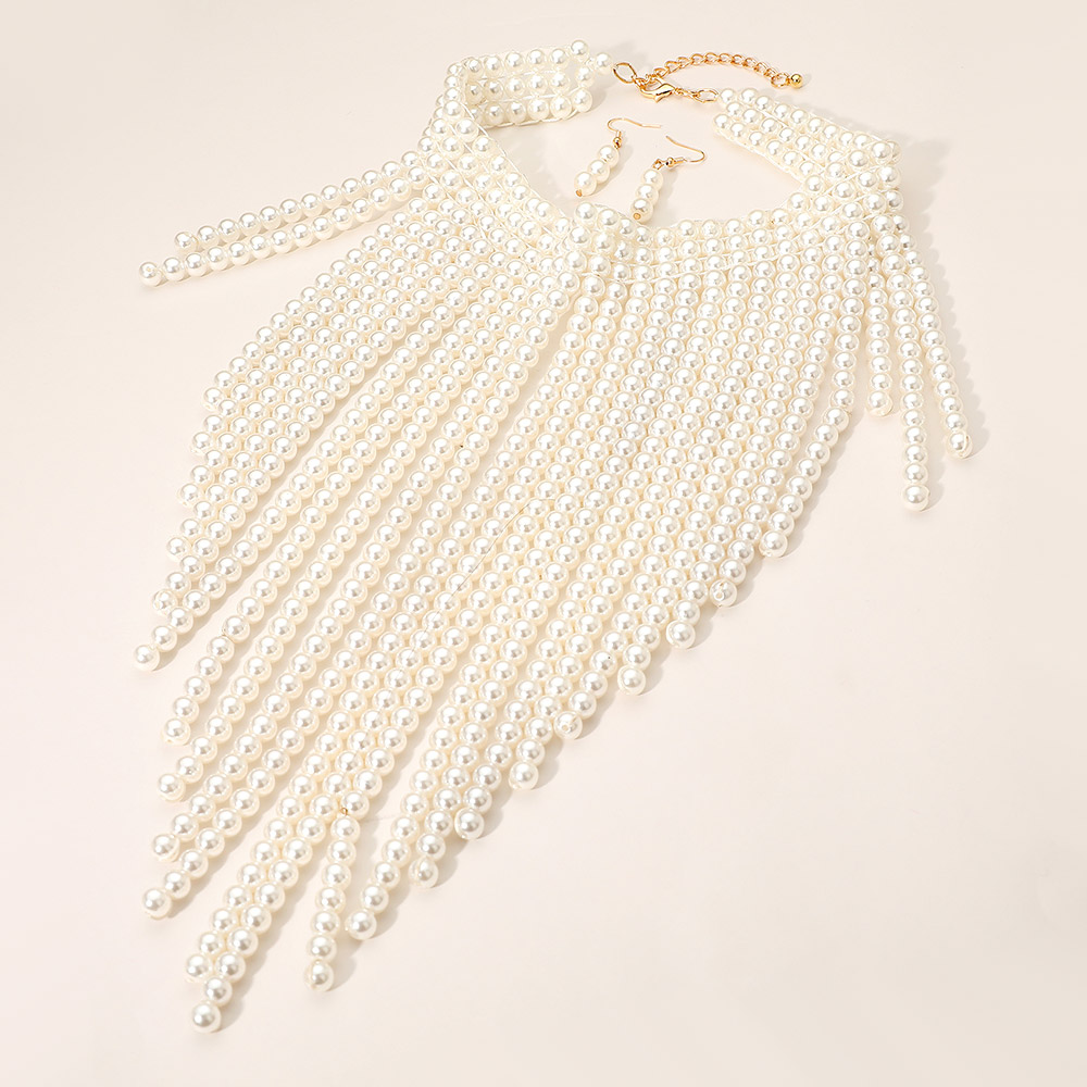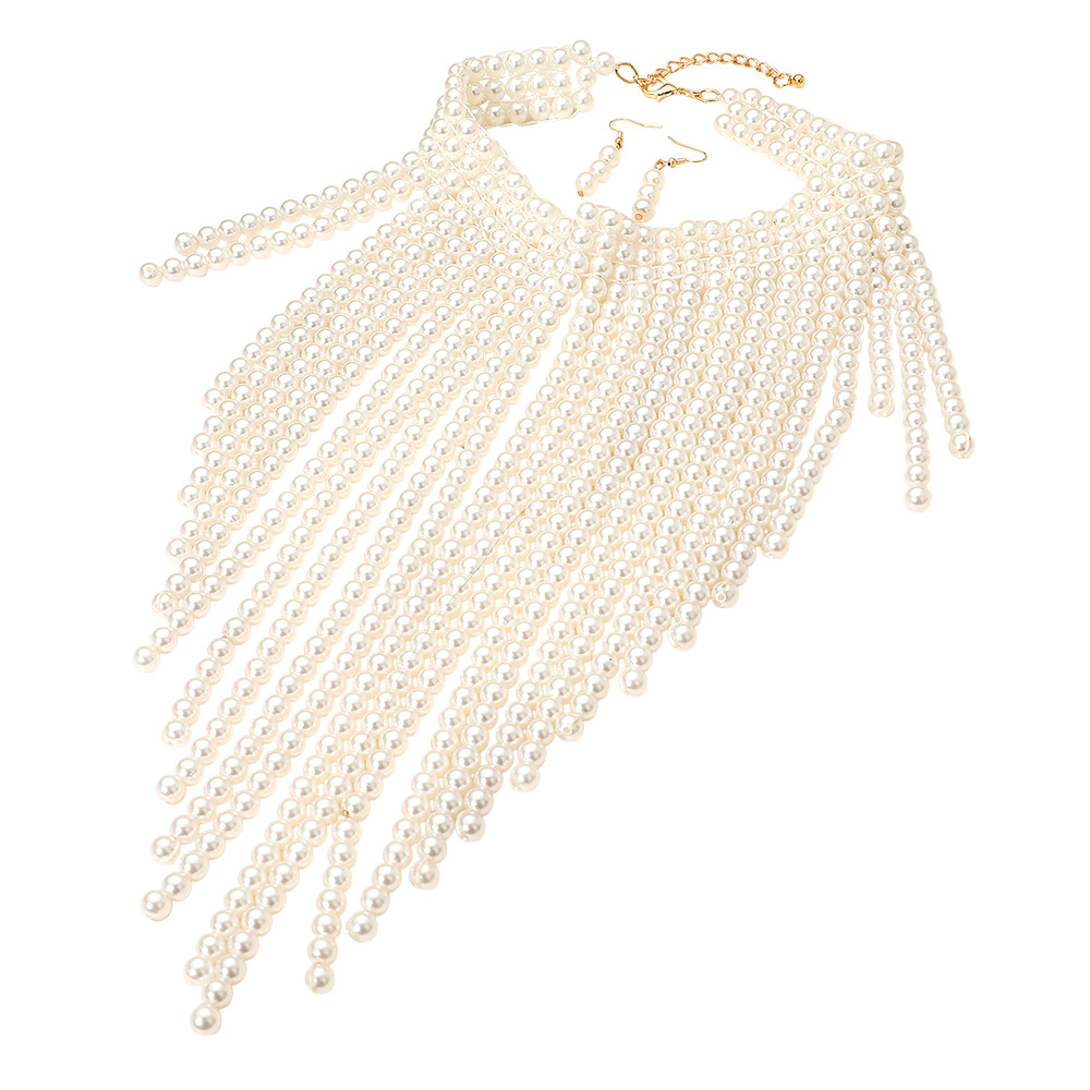 Details • Necklace Size : 15.5" + 3" L • Decor Size : 12" L • Earrings Size : 1.75" L • This layered pearl-inspired necklace set showcases cascading strands that create a dramatic fringe effect for a show-stopping look. Paired with matching dangling earrings, it’s perfect for glamorous occasions, formal events, or adding elegance to evening wear. • Lead and Nickel Compliant