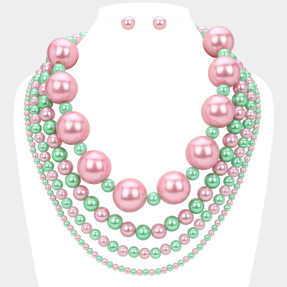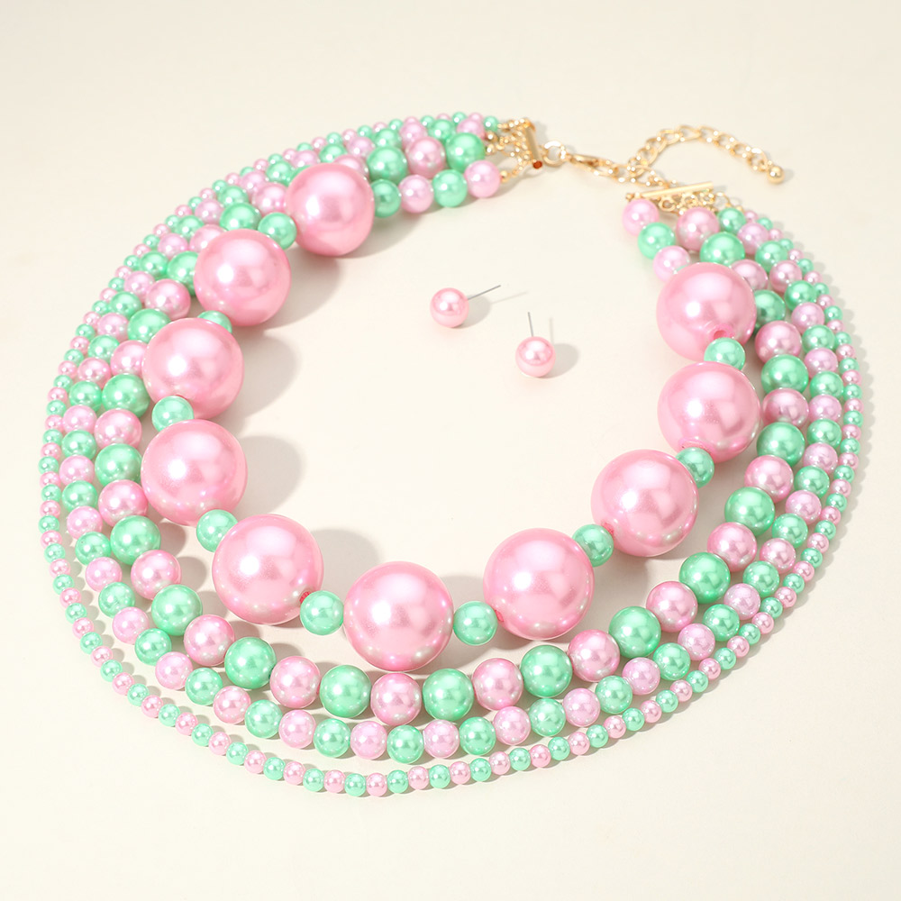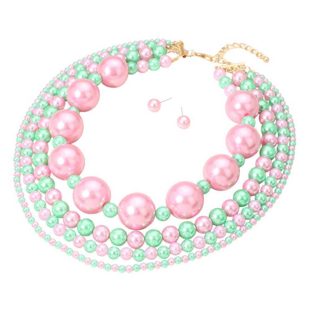Details • Necklace Size : 21.5" + 3.25" L • Decor Size : 3" L • Earrings Size : 0.4" L • Elegant multi-layered necklace set featuring bold pearl-like beads in alternating sizes, paired with classic stud earrings. Perfect for formal events, evening parties, or special occasions, this statement piece adds a touch of sophistication and drama to any look with its striking layered design. • Lead and Nickel Compliant