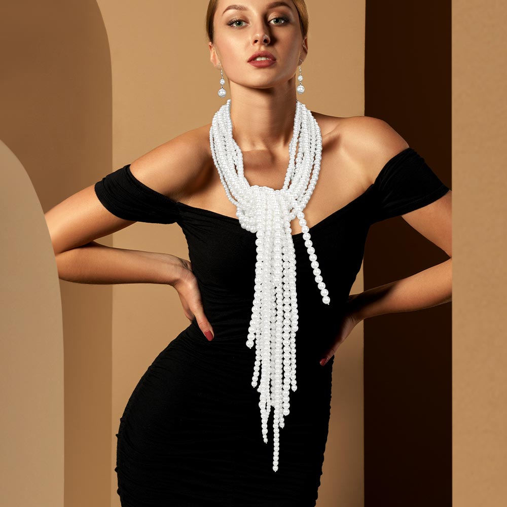 Details • Necklace Size : 54" L • Decor Size : 2.25" L • Earrings Size : 2" L • Make a bold fashion statement with this long multi-strand beaded necklace, featuring cascading layers and matching earrings. Designed to drape elegantly, this versatile set is perfect for formal occasions, cocktail parties, or elevating your everyday style. • Lead and Nickel Compliant