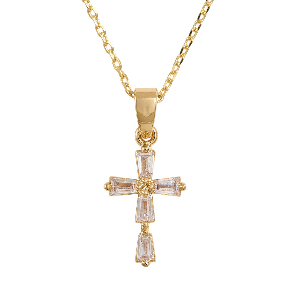 Details • Necklace Size : 16" + 2" L • Pendant Size : 0.4" X 0.7" • This cross pendant necklace showcases a sleek design with baguette-cut stones for a refined, modern touch. A timeless symbol of faith, it’s perfect for everyday wear or as a meaningful gift, offering both elegance and radiant brilliance. • CZ Cubic Zirconia • Gold Dipped • Made In Korea