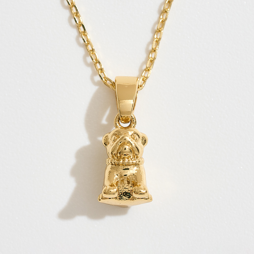 Details • Necklace Size : 16" + 2" L • Pendant Size : 0.25" X 0.6" • Adorable and unique, this bulldog pendant necklace is a playful accessory for animal lovers. Its detailed design brings charm and personality, making it a perfect gift or a fun statement piece to express your love for pets while adding a stylish touch to any outfit. • Gold Dipped • Made In Korea